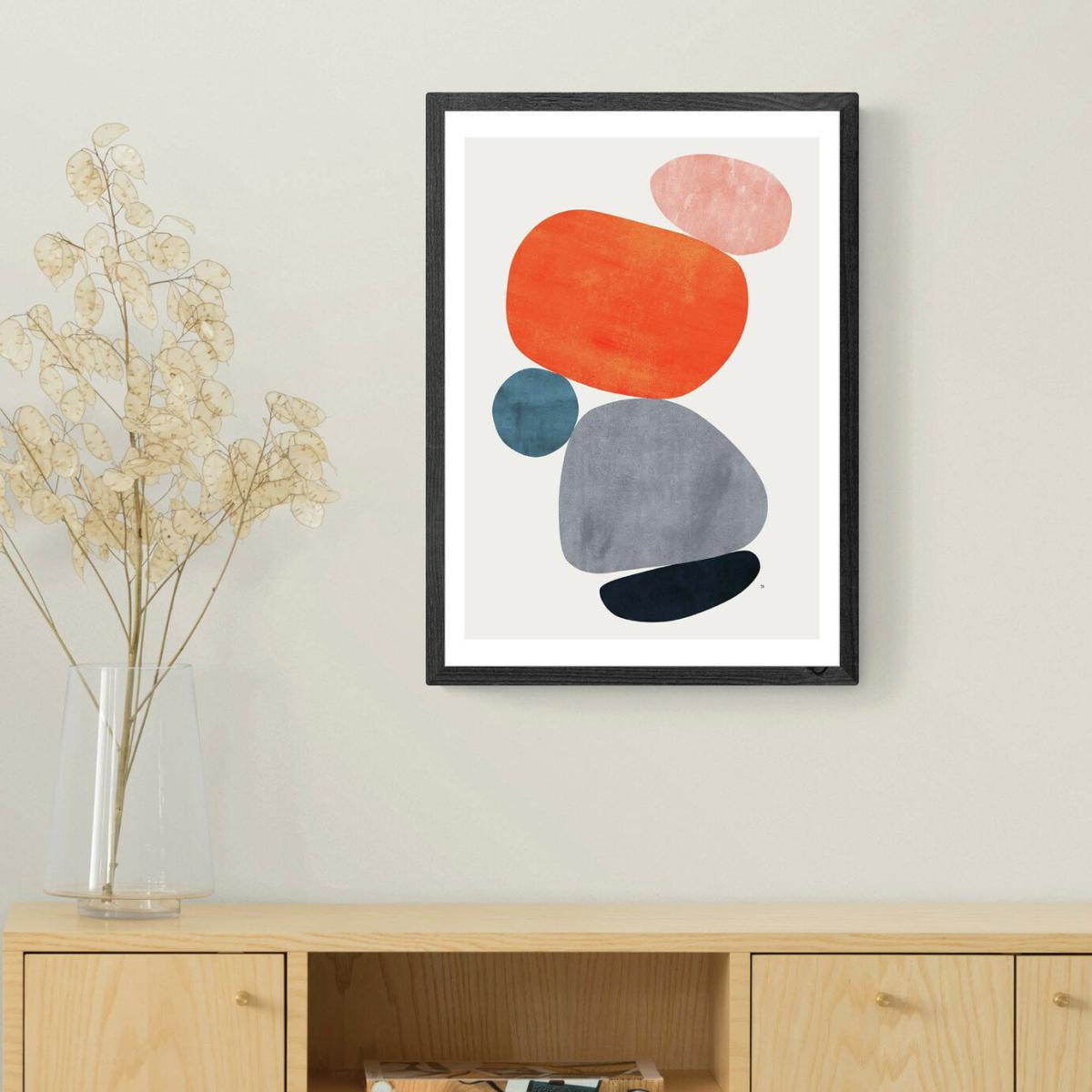 I love the Tracie Andrews print for its modern, abstract feel and versatile colour palette. It works well in contemporary or minimalist interiors, adding a splash of colour without overwhelming the space. This print is ideal for living rooms, bedrooms, or hallways where a touch of visual interest is needed. For styling, consider pairing it with sleek black or white frames to echo the border, and hang it at eye level for maximum impact. To keep the look cohesive, coordinate accessories with its colours-think soft cushions, throws, or accessories in the muted blue, warm orange, or grey tones. It’s a great piece for adding visual balance and a pop of colour to a pared-back room.