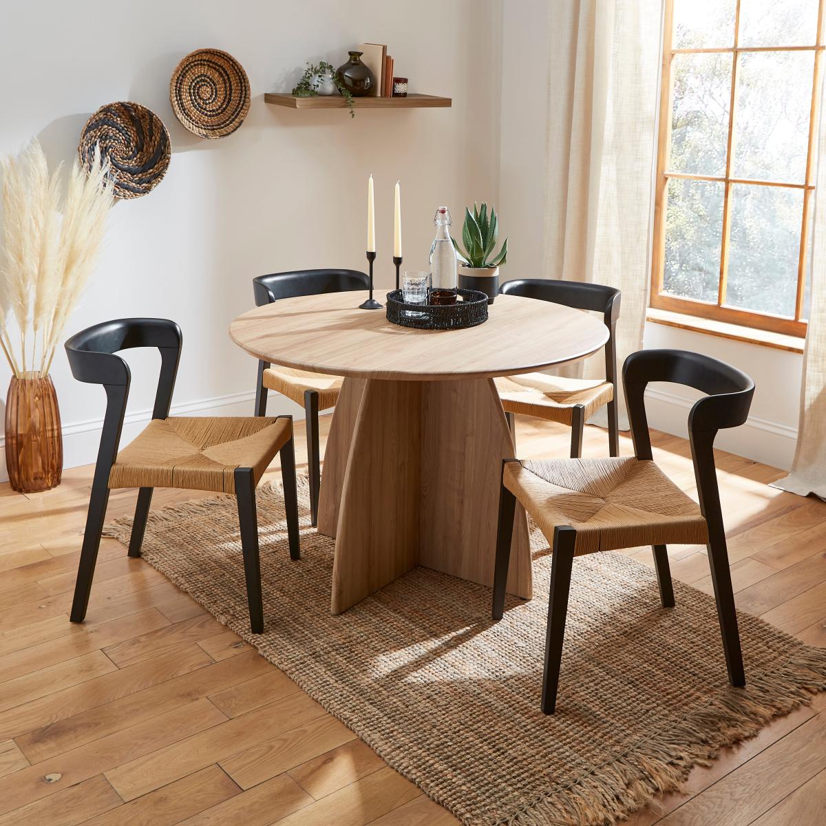 I’m a fan of the Effy round table for its clean, wood-effect finish and space-saving circular design - it works brilliantly in compact kitchens or open-plan living areas. Its neutral tone slots effortlessly into Scandi, coastal or contemporary interiors, pairing well with woven chairs or sleek black accents for a touch of contrast. For styling, anchor it on a natural-fibre rug to define the dining zone, then keep centrepieces minimal - a simple ceramic vase with foliage or a trio of tapered candles works well. Add a mix of textures around the room (think linen curtains or rattan baskets) to complement the table’s organic feel.