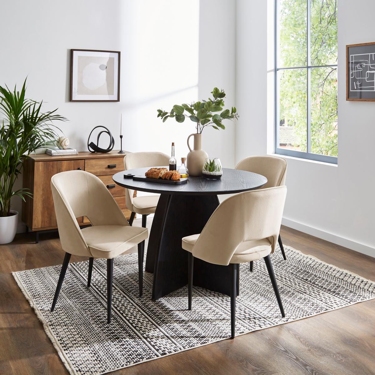 * Dining furniture bundle* In this bundle, you'll receive: 1 x Effy Dining Table, 4 x Lillia Dining Chairs* Timeless, stylish design* Seats up to 4. The sleek tabletop design perfectly complements a modern interior, while the round shape fosters an intimate dining experience. The chairs feature a generously proportioned, foam-filled seat for added comfort. Inspired by modern art deco designs, this stylish chair is crafted with a curved back and black finished metal legs to add a contemporary touch.