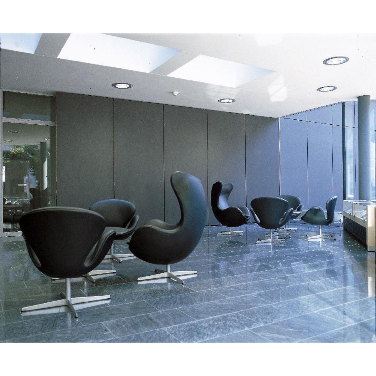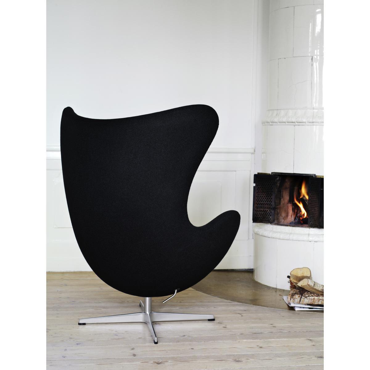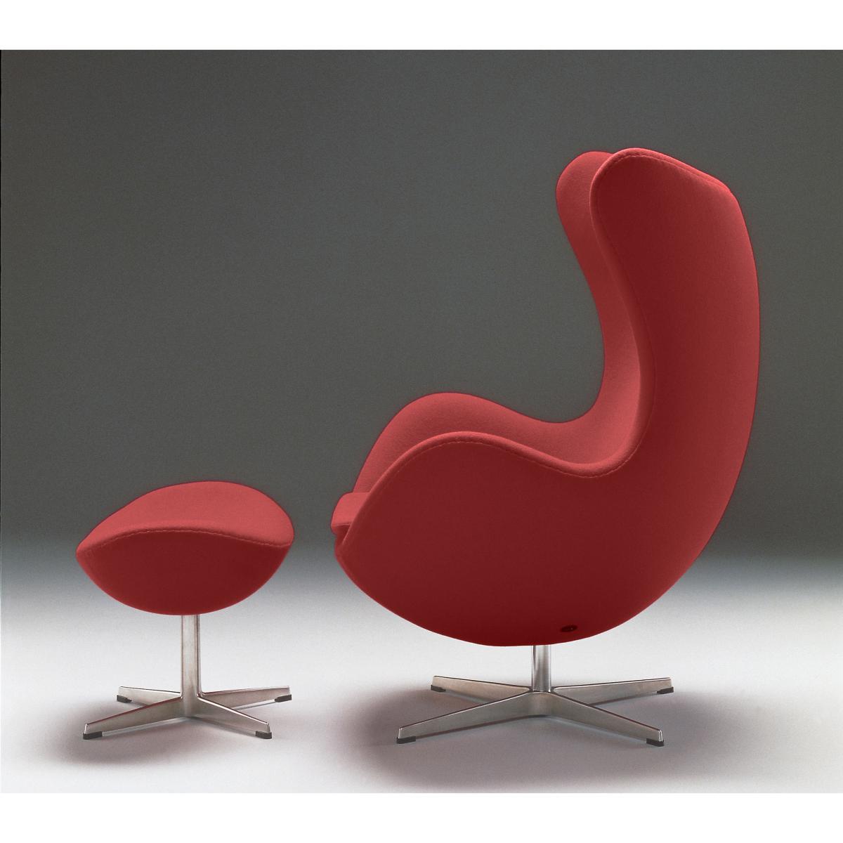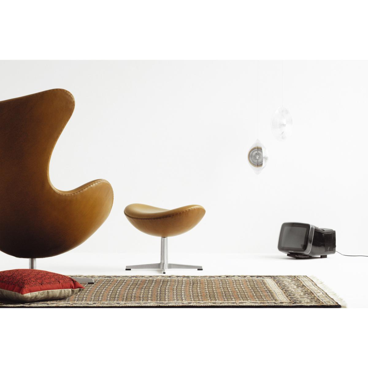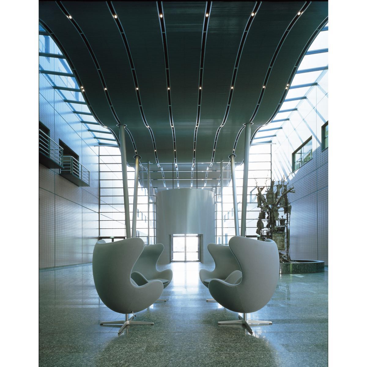 Arne Jacobsen designed the Egg for the lobby and reception areas in the Royal Hotel, in Copenhagen. The commission to design every element of the hotel building as well as the furniture was Jacobsen's grand opportunity to put his theories of integrated design and architecture into practice. The Egg is one of the triumphs of Jacobsen's total design - a sculptural contrast to the building's almost exclusively vertical and horizontal surfaces. The Egg sprang from a new technique, which Jacobsen was the first to use : a strong foam inner shell underneath the upholstery. Like a sculptor, Jacobsen strove to find the shell's perfect shape in clay at home in his own garage. Because of the unique shape, the Egg guarantees a bit of privacy in otherwise public spaces and the Egg - with or without footstool - is ideal for lounge and waiting areas as well as the home. The Egg is available in a wide variety of fabric upholstery as well as leather, always combined with a star shaped base in satin polished aluminium.