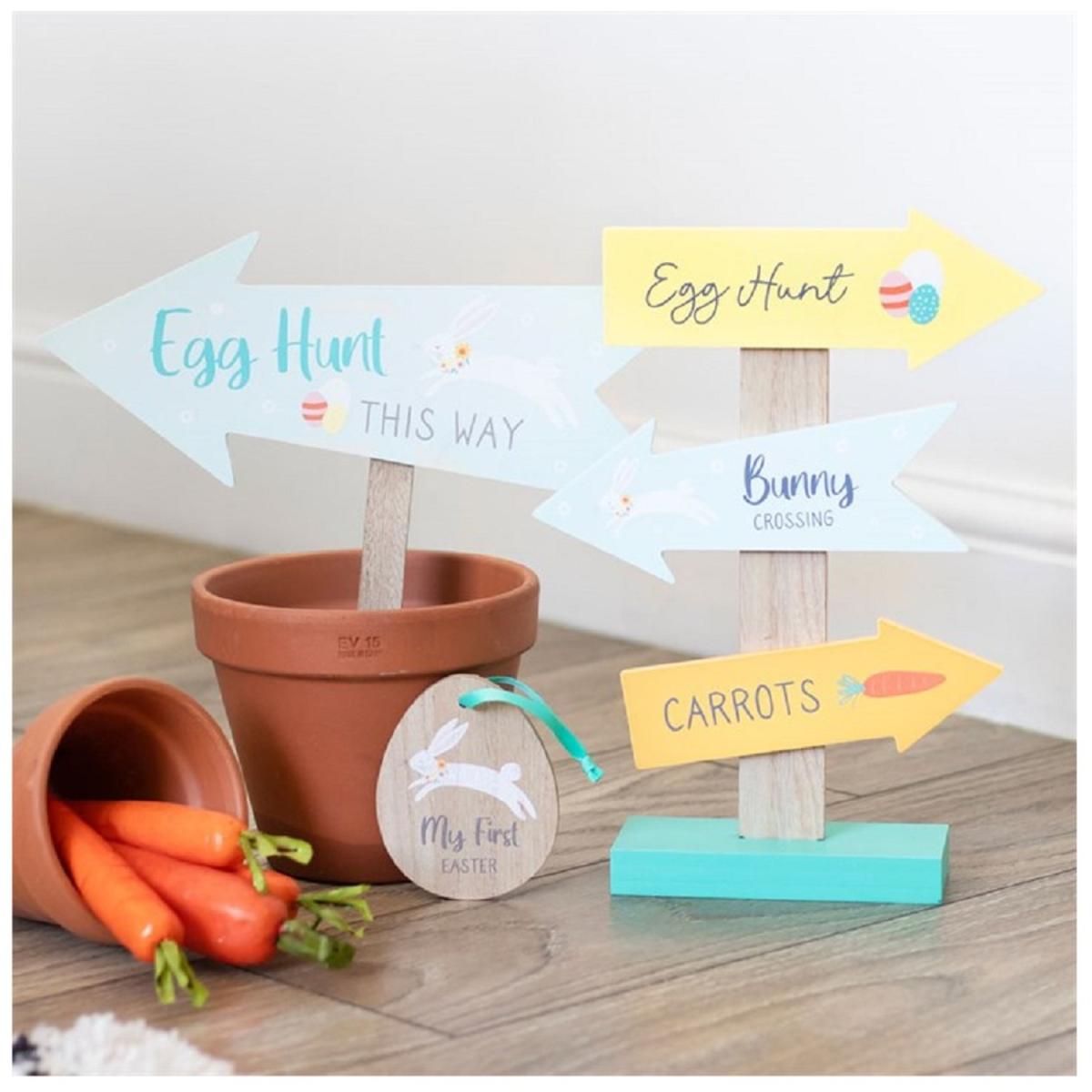 Ensure everyone knows where the egg hunt is by simply placing this adorable sign stake in flowerbeds, plant pots or next to pathways to direct participants to the festivities. Simply place them in flowerbeds, plant pots, or pathways.