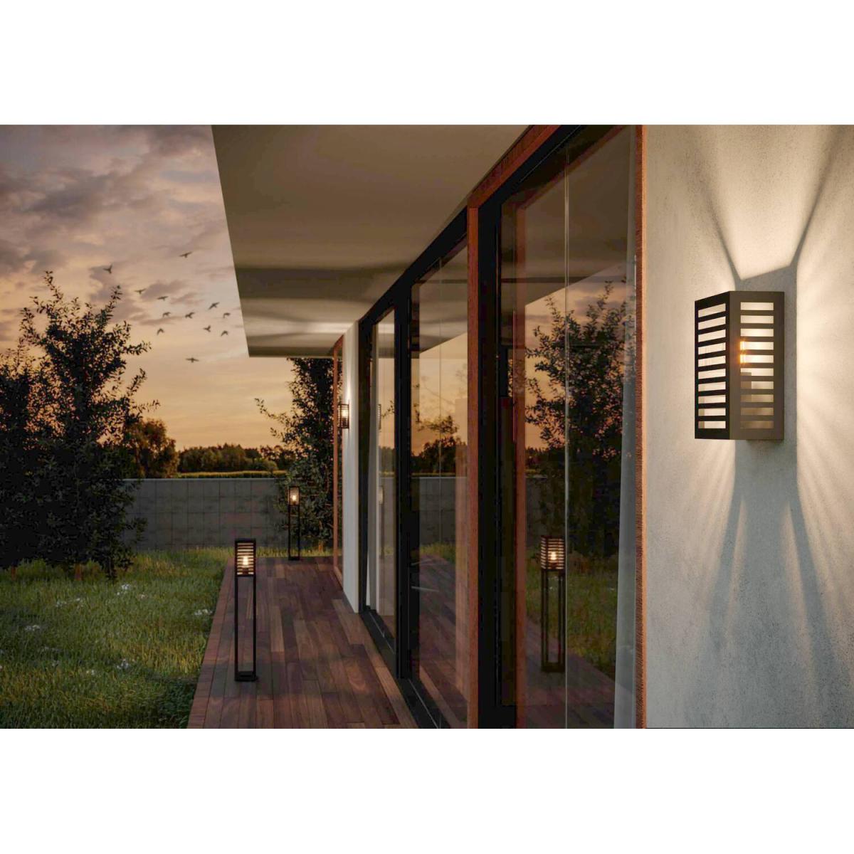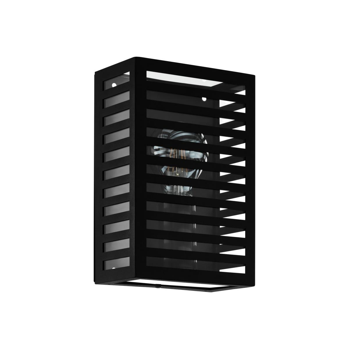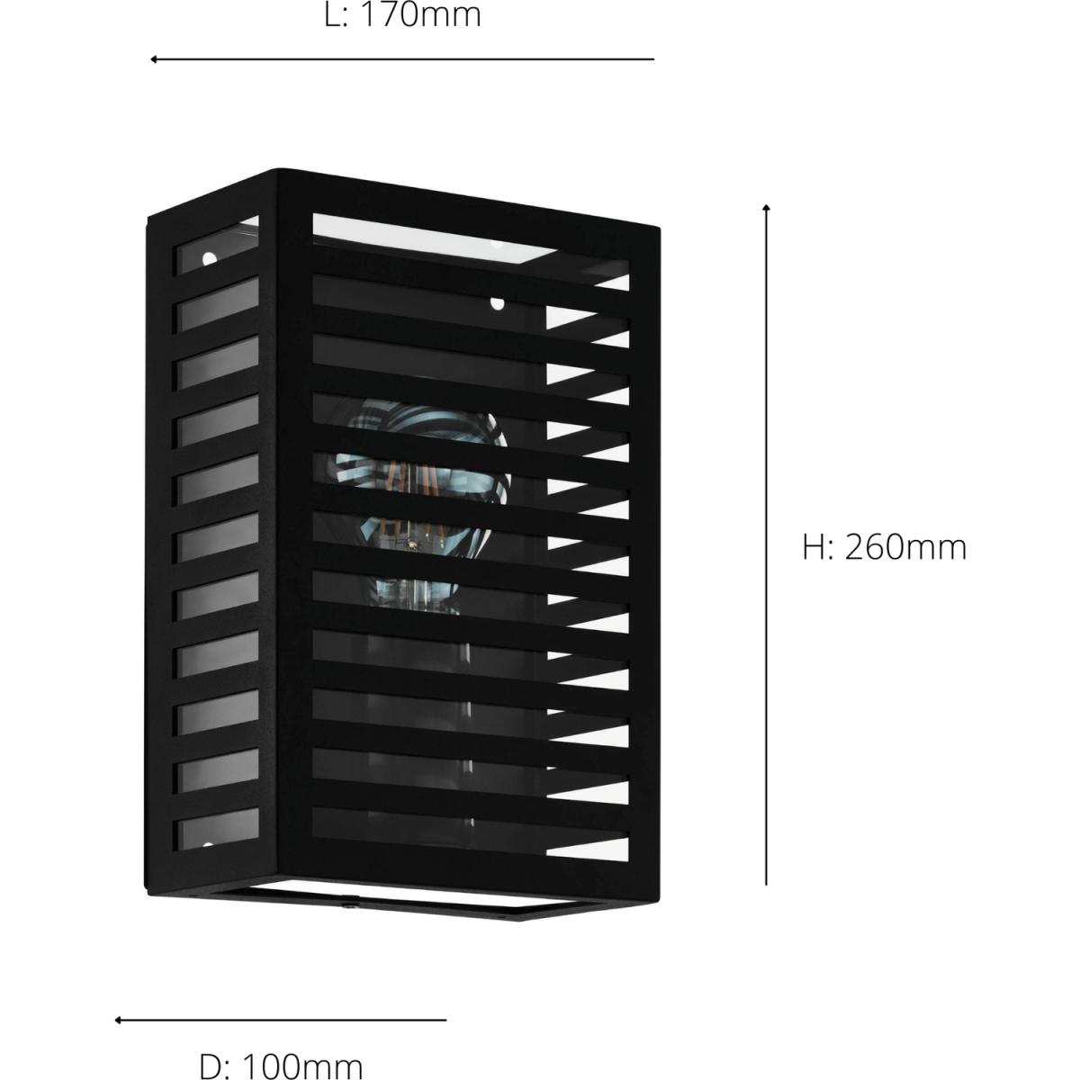 The Alamonte 3 is a contemporary caged exterior wall light with a striped black steel design and visible-lightbulb style. The fitting has a rectangular structure with a clear inner shade, creating a dramatic lighting ambience with this panelled design. The product has an IP44 rating meaning it is suitable for outdoor use and will complement a range of exterior styles.