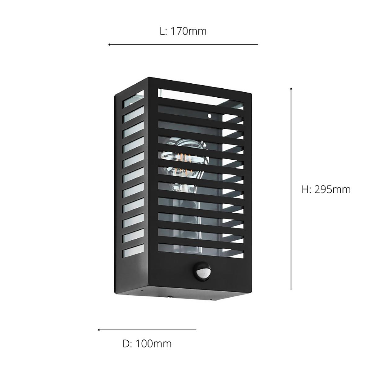 The Alamonte 3 is a contemporary caged exterior wall light with a striped black steel design and visible-lightbulb style. The fitting has a rectangular structure with a clear inner shade, creating a dramatic lighting ambience with this panelled design. The product has an IP44 rating meaning it is suitable for outdoor use and will complement a range of exterior styles. The product adds security to your home with its integrated sensor, which has a detection angle of 90 degrees and up to 6 metres.