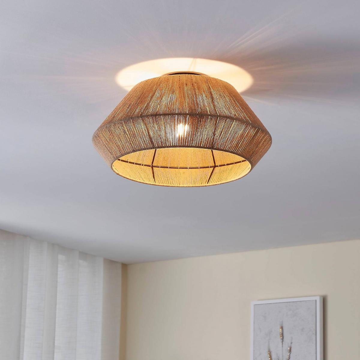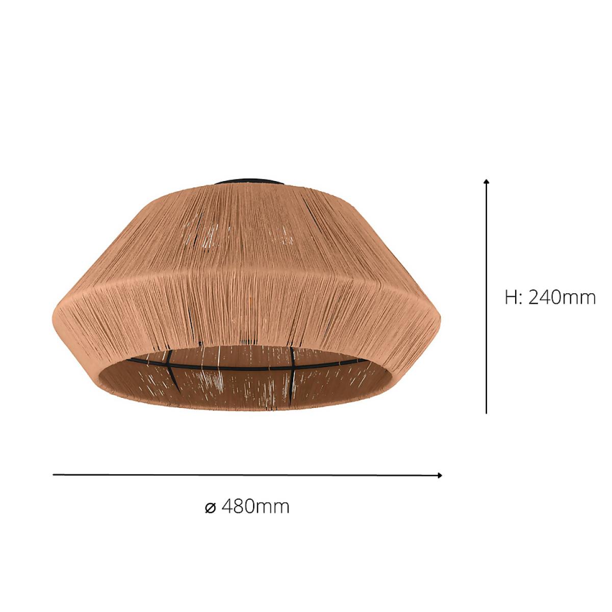 The ALDERNEY ceiling light features a diamond-shaped wire lampshade wrapped with natural hemp yarn. With a modern blend of black metal and natural materials, the ceiling light provides cosy lighting for any space, whether in the kitchen, living room, bedroom or hallway. The product has an E27 lamp holder and requires an E27 lightbulb, which is not included.