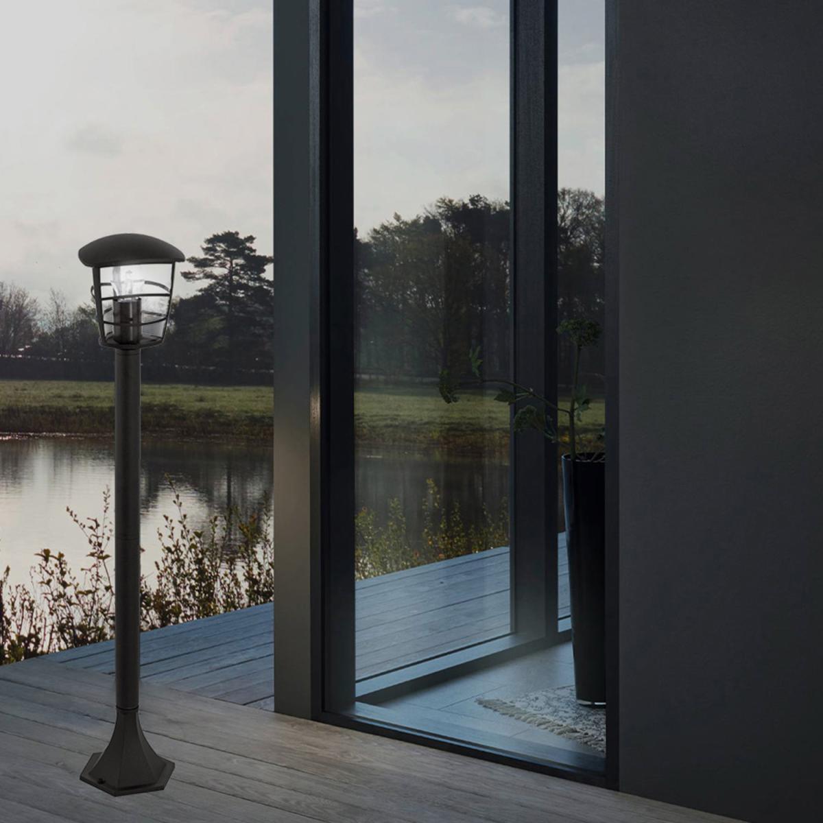 The ALORIA pathway light has a modern (upright) lantern design with a black cast aluminium body and clear plastic panes. The design gives a direct view of the lightbulb. The bollard light is suitable for outdoor use due to its IP44 protection against spray water, and its classic style will beautifully complement your outdoor space. The product has an E27 lamp holder and requires 1 x E27 lightbulb, which is not included.
