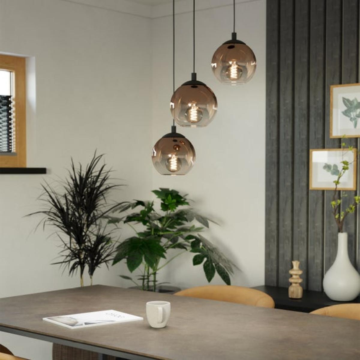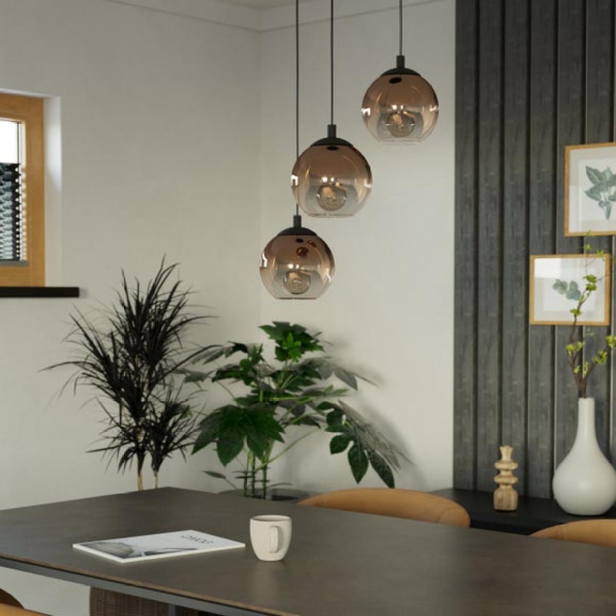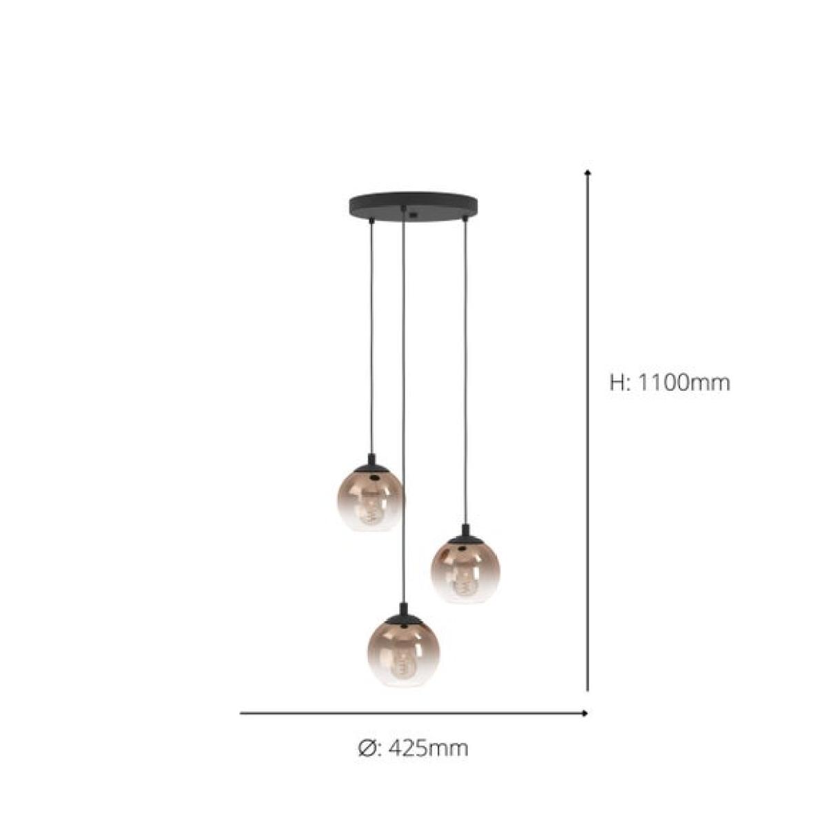 * Striking steel frame * vaporised glass shade * Requires 3 x E27 Bulbs (not included) * Adjustable height Bring a touch of industrial charm with a modern twist into your home with this stunning cluster ceiling light. The beautiful black steel frame and copper-coloured glass shade add a touch of sophistication and create a warm, inviting glow. It's the perfect statement piece for your dining room or kitchen.