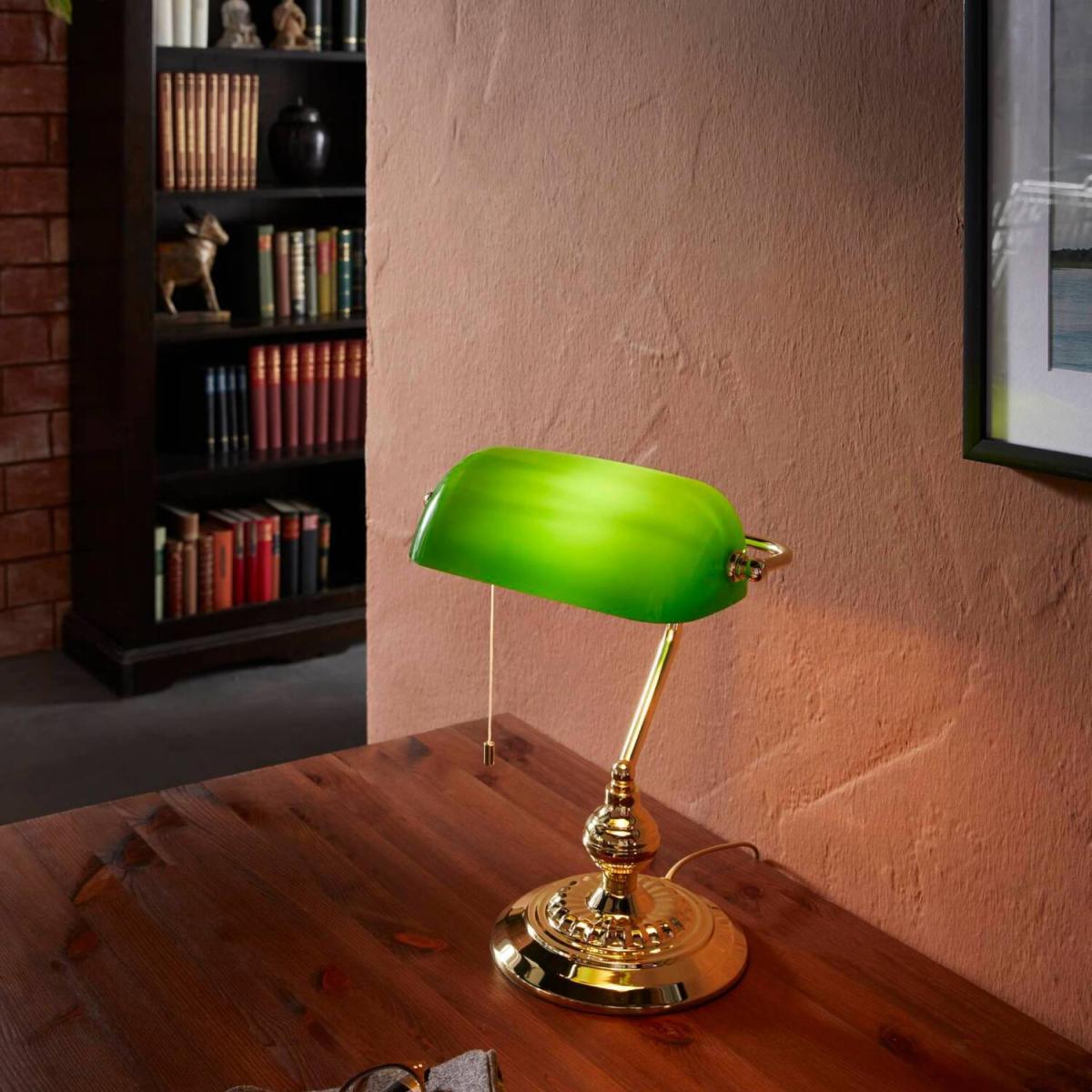 The Banker is a contemporary look at a traditional design and a stunning choice for an office or home lighting. The product has an ornate brass-coloured steel base with a painted green glass shade. The lampshade is adjustable, adding direct or ambient light where you need it most. This is a statement choice for interior lighting and is operated by a cord switch.