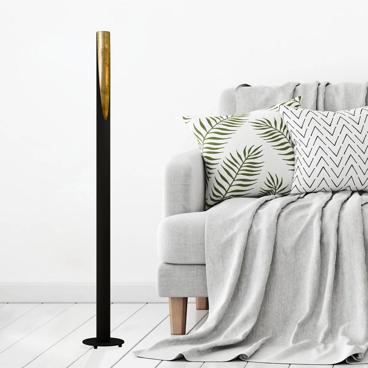 The BARBOTTO tube-shaped LED floor lamp has a black metal body with a gold-coloured inner lining. The design casts a pleasant warm white light indirectly around the room and produces a warm glow due to the gold-coloured finish. The slanted upper part of the floor lamp reveals the elegant inner surface with a gold leaf-style finish. The floor light can switch on and off easily using the in-line floor switch. With a stylish linear design, the product provides elegant lighting that creates a cosy atmosphere in any space. The product includes a GU10 LED lightbulb.