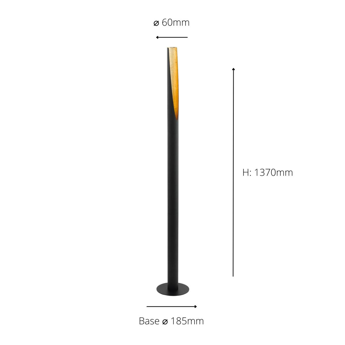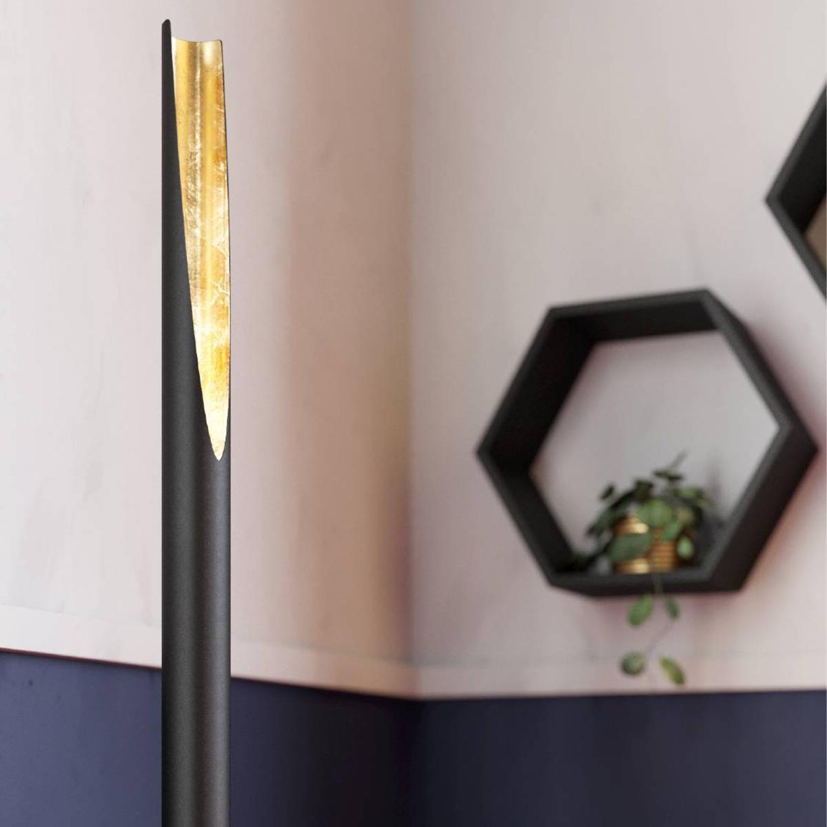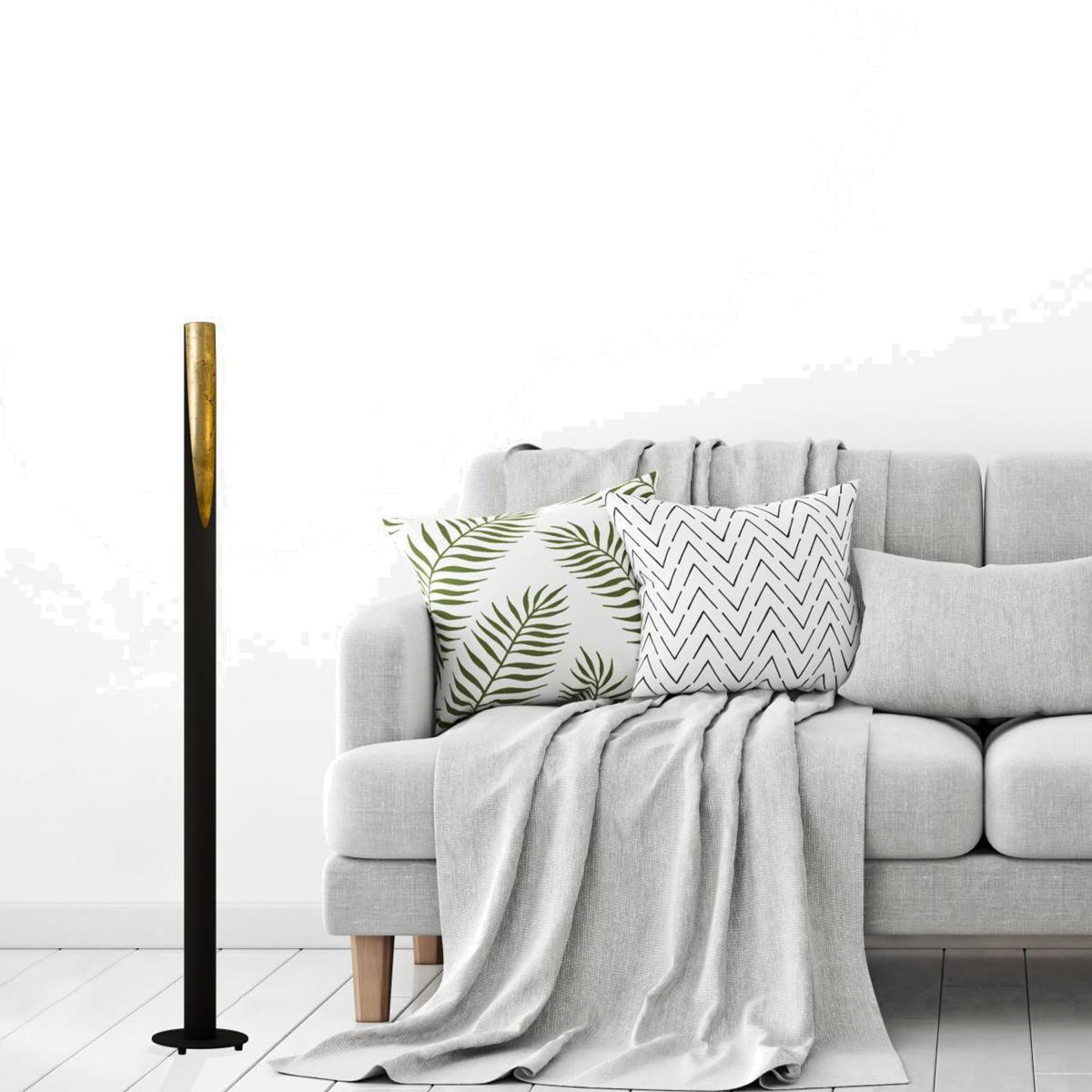 The Barbotto tube-shaped LED floor lamp has a black metal body with a gold-coloured inner lining. The design casts a pleasant warm white light indirectly around the room and produces a warm glow due to the gold-coloured finish. The slanted upper part of the floor lamp reveals the elegant inner surface with a gold leaf-style finish. The floor light can switch on and off easily using the in-line floor switch. With a stylish linear design, the product provides elegant lighting that creates a cosy atmosphere in any space. The product includes a GU10 LED lightbulb.