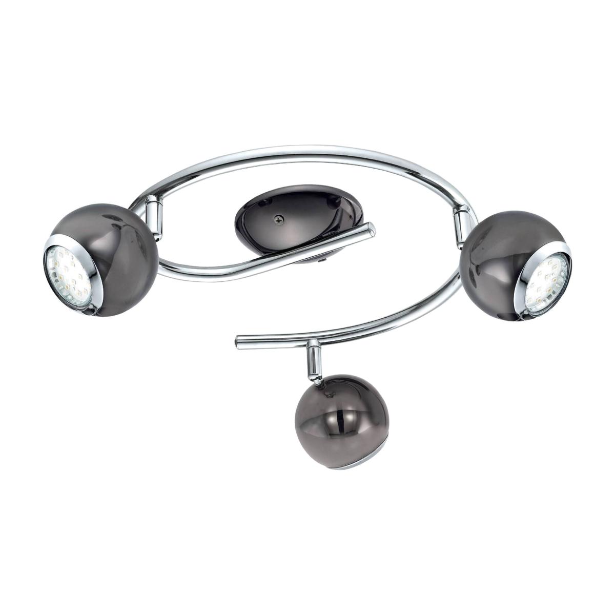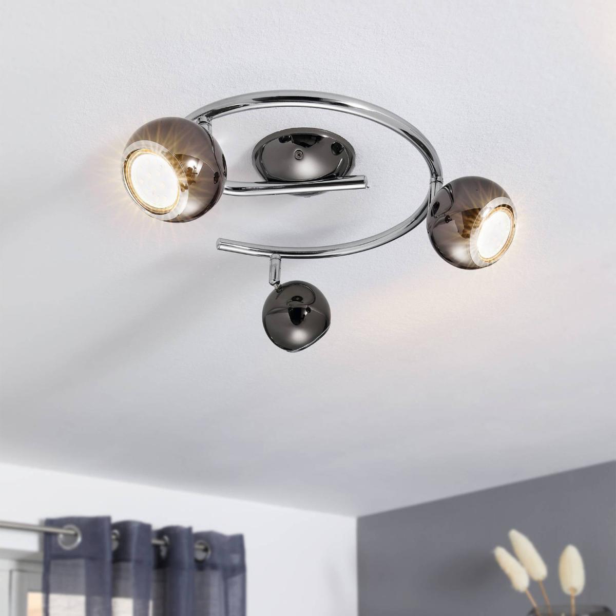 An ultra-modern design with a polished chrome finish, the BIMEDA features a spiral design and three adjustable spotlight heads in nickel-nero and chrome-plated steel. The product includes 3 x GU10-LED lightbulbs that produce a warm white light when illuminated, promoting energy efficiency and cost-saving capabilities. The BIMEDA is a modern ceiling light tailored for contemporary homes, featuring a spotlight design and a sleek metal finish. Its compact design makes it a perfect fit for UK homes with low ceilings, especially in spaces like the kitchen, bedroom, or lounge.
