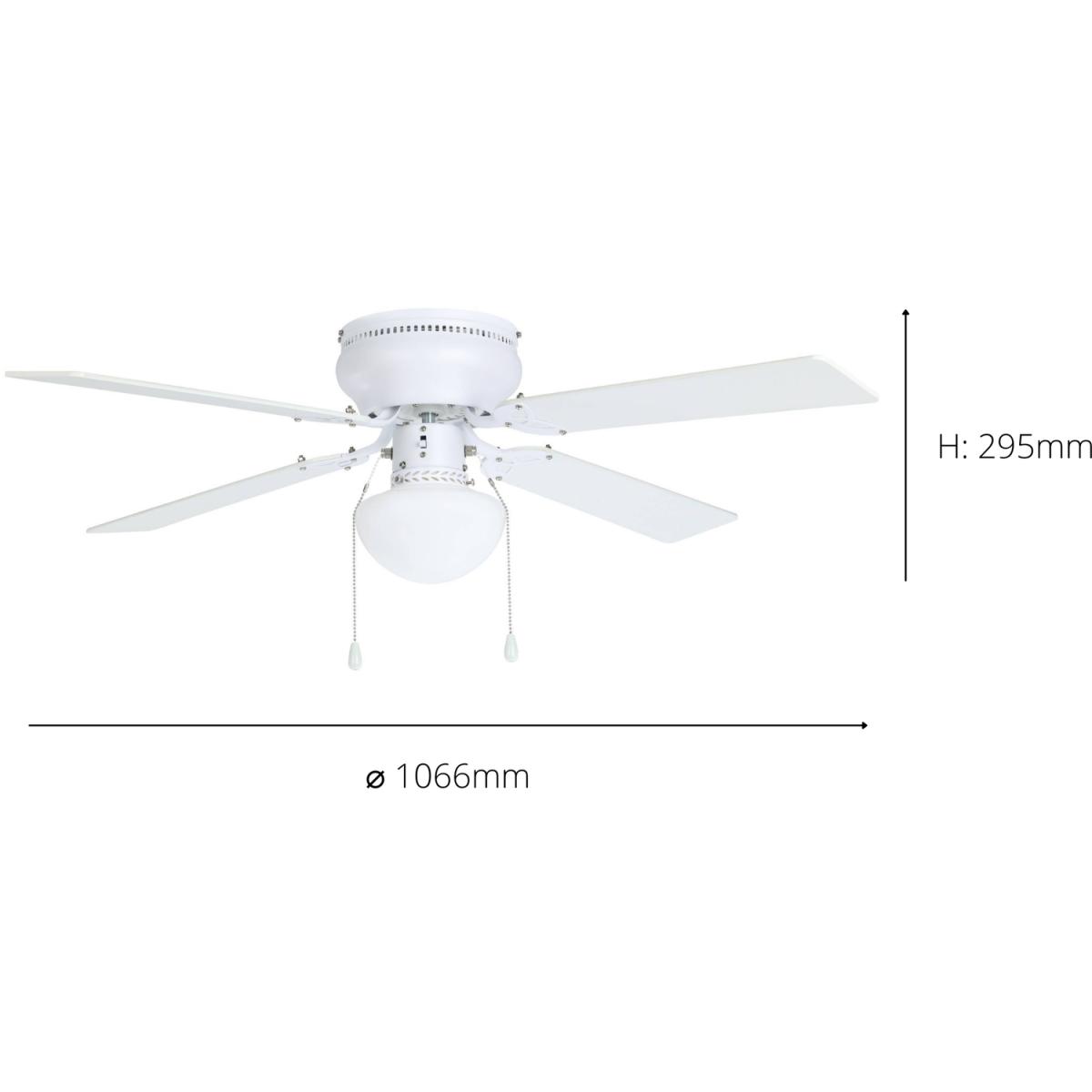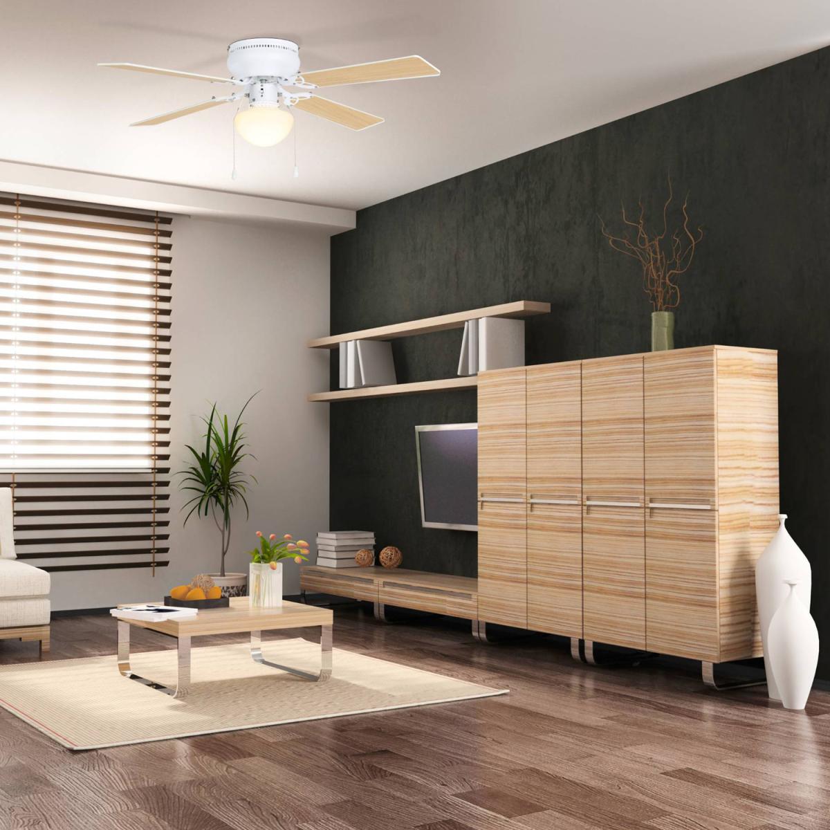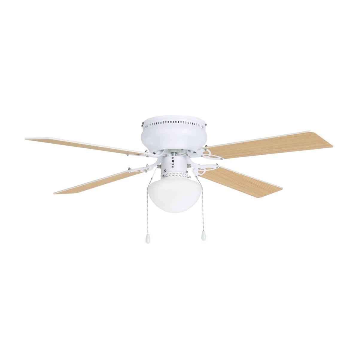 The CAGLIARI ceiling fan features a classic design with a steel structure in a matte white finish and has four reversible blades so that either the wooden effect or the white side is visible. This multifunctional ceiling fan has an E27 lamp holder, allowing you to circulate the air and illuminate a room at the same time. The light source is enclosed by a white-coated glass lampshade which produces a welcoming glow once the product is on. The ceiling fan's traditional style blends seamlessly into any interior space, fitting perfectly into the living room or bedroom. The product requires 1 x E27 lightbulb, which is not included.