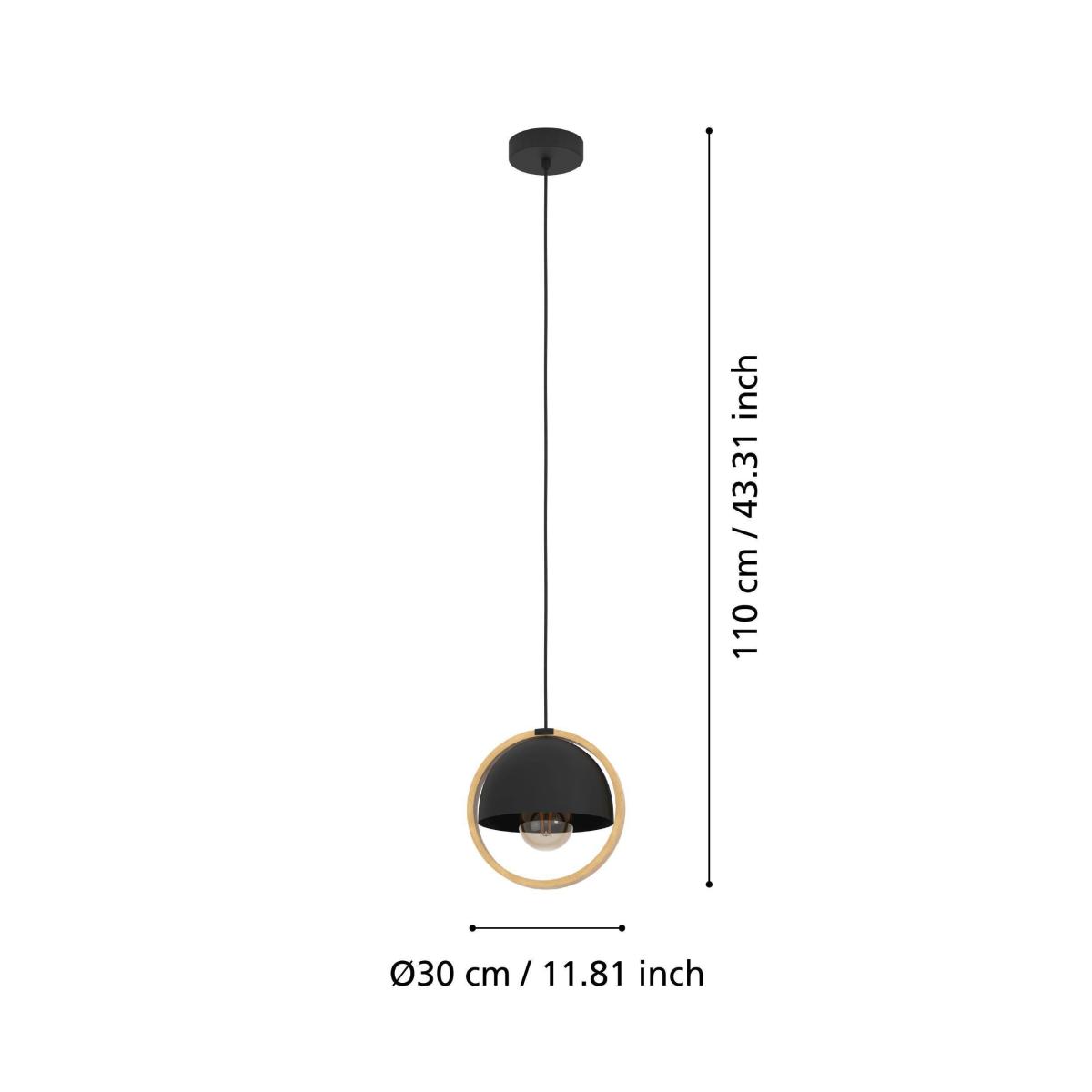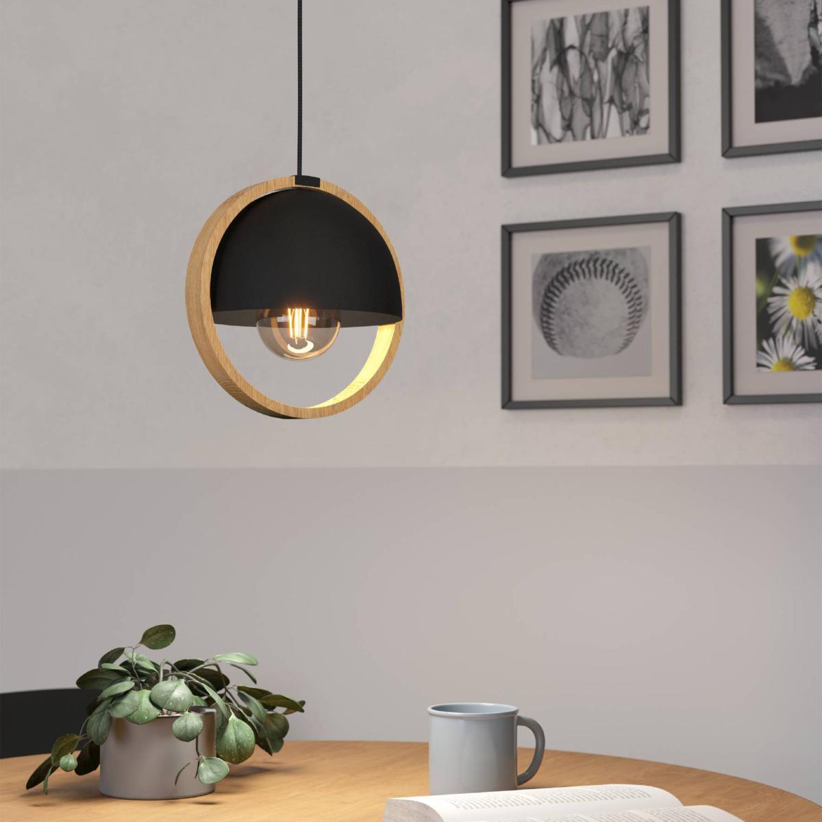 * IP20 rating* Requires 1 x E27 Bulb (not included)* Height Adjustable* 2 Year Guarantee The Callow pendant light has a round lampshade with a black steel finish surrounded by a natural wood ring. The shade suspends on a black textile cable from a metal canopy of the same colour. With its minimalist yet distinctive design, the pendant light provides stylish lighting for any modern interior, whether in the living room or above the dining room table.