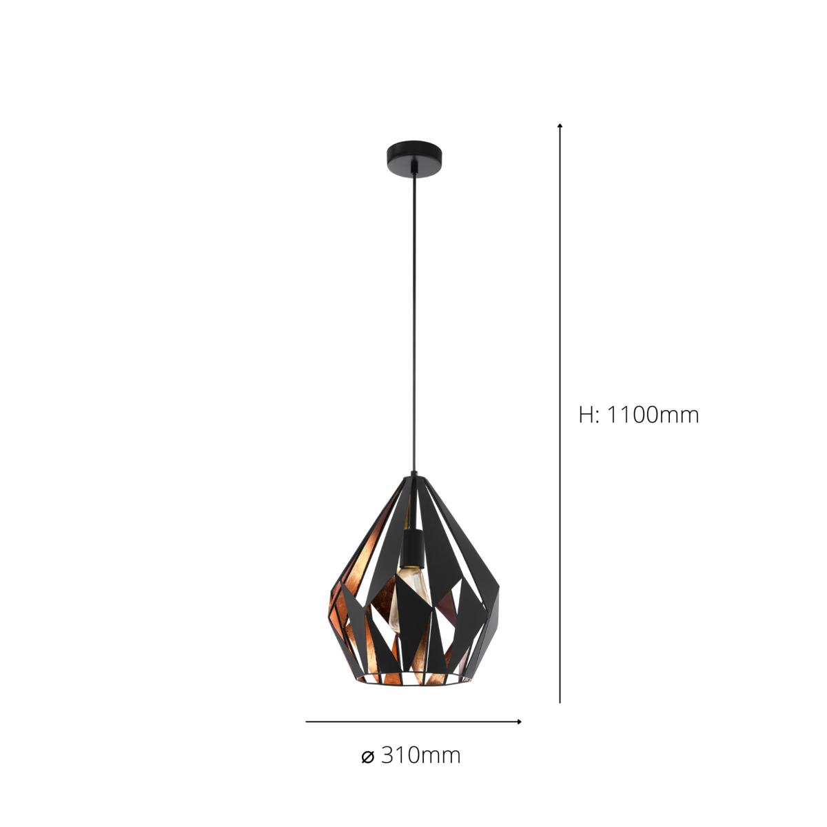 * IP20 rating* Requires 1 x E27 Bulb (not included)* Height Adjustable* Copper Finish* 2 Year Guarantee The Carlton 1 is a trend-setting pendant with a geometric and cut-out design. The fitting draws from vintage influences and adds a metallic pop to your interior with its contrasting black and copper steel finish. The product requires 1 x E27 lightbulb, which is not included and would complement a large retro-style lightbulb to complete the vintage feel.