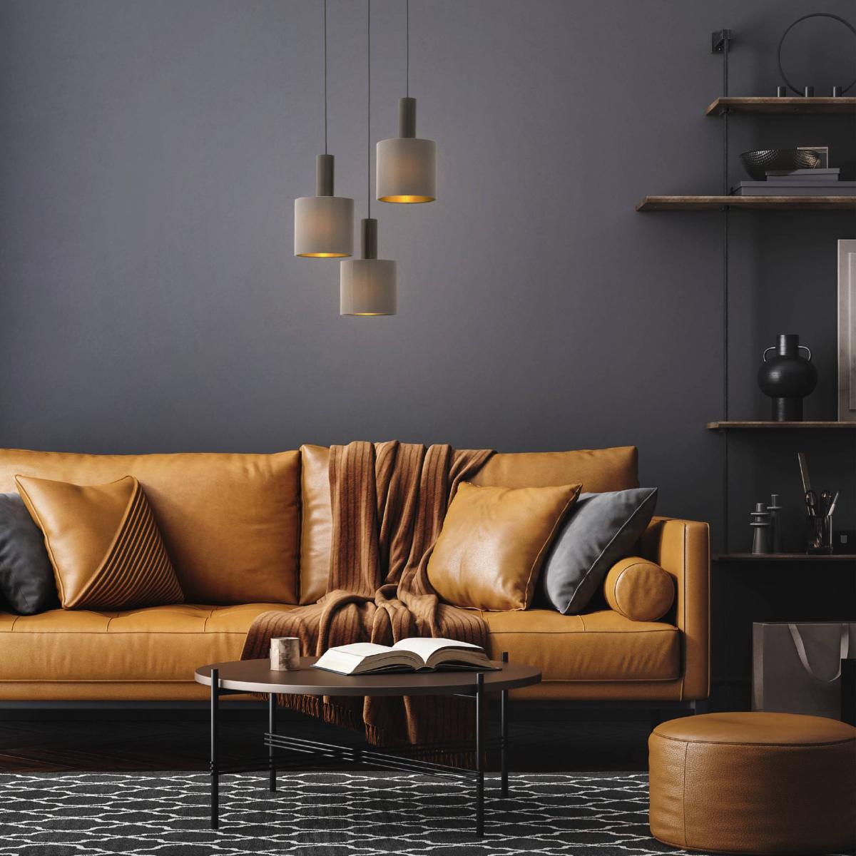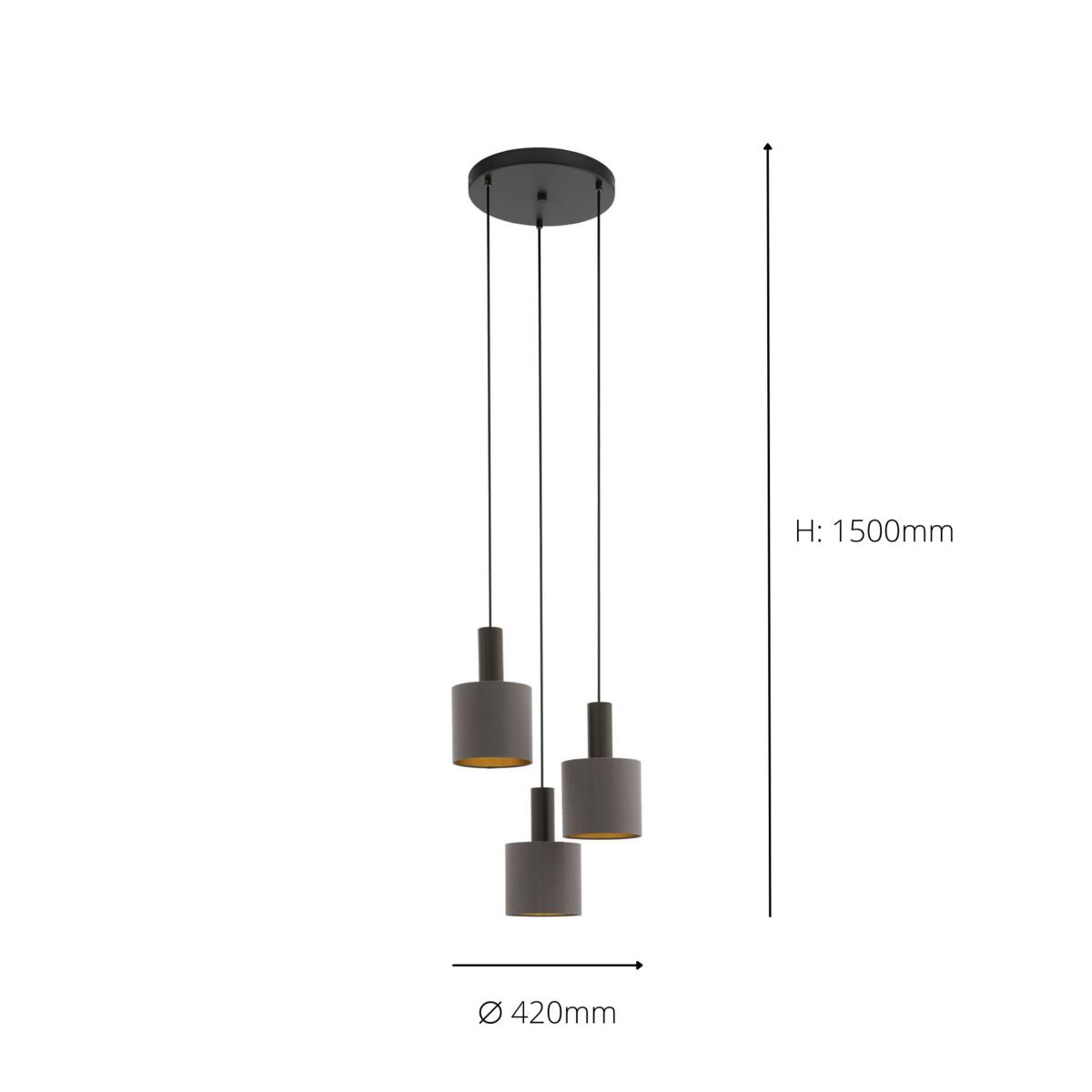 * IP20 rating* Requires 3 x E27 Bulb (not included)* Height Adjustable* 2 Year Guarantee The Concessa 1 cluster pendant light features three round fabric lampshades with a cappuccino finish and a gold-coloured lining. The dark brown metal lamp holders and ceiling mount complement the sophisticated design of the lighting fixture. The pendant light is a lovely addition to any modern interior and provides welcoming lighting in the living or dining room. The product has 3 x E27 lamp holders and requires 3 x E27 lightbulbs, which are not included.