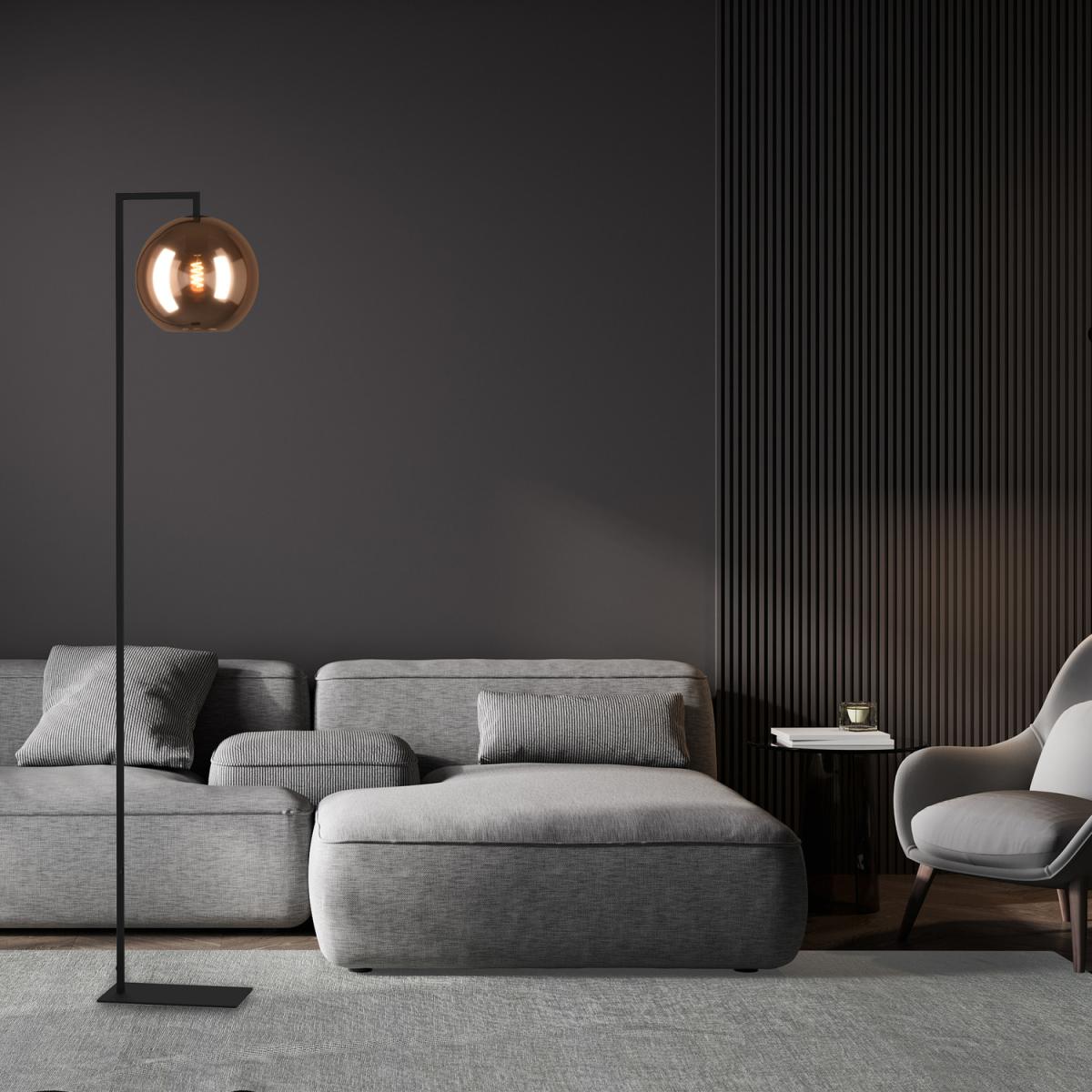 The Cordoba floor lamp, a versatile lighting solution, features a black steel base paired with a coated glass sphere in a copper finish that points downwards. The floor lamp can be switched on and off easily using the in-line foot switch. The mirrored finish means the lightbulb is only visible when switched on, giving the light an elegant yet unique look. The floor lamp is the perfect finishing touch for modern and minimalist interiors, providing stylish lighting for your space, whether in the living room or dining room. The product has an E27 lamp holder and requires 1 x E27 lightbulb, which is not included.
