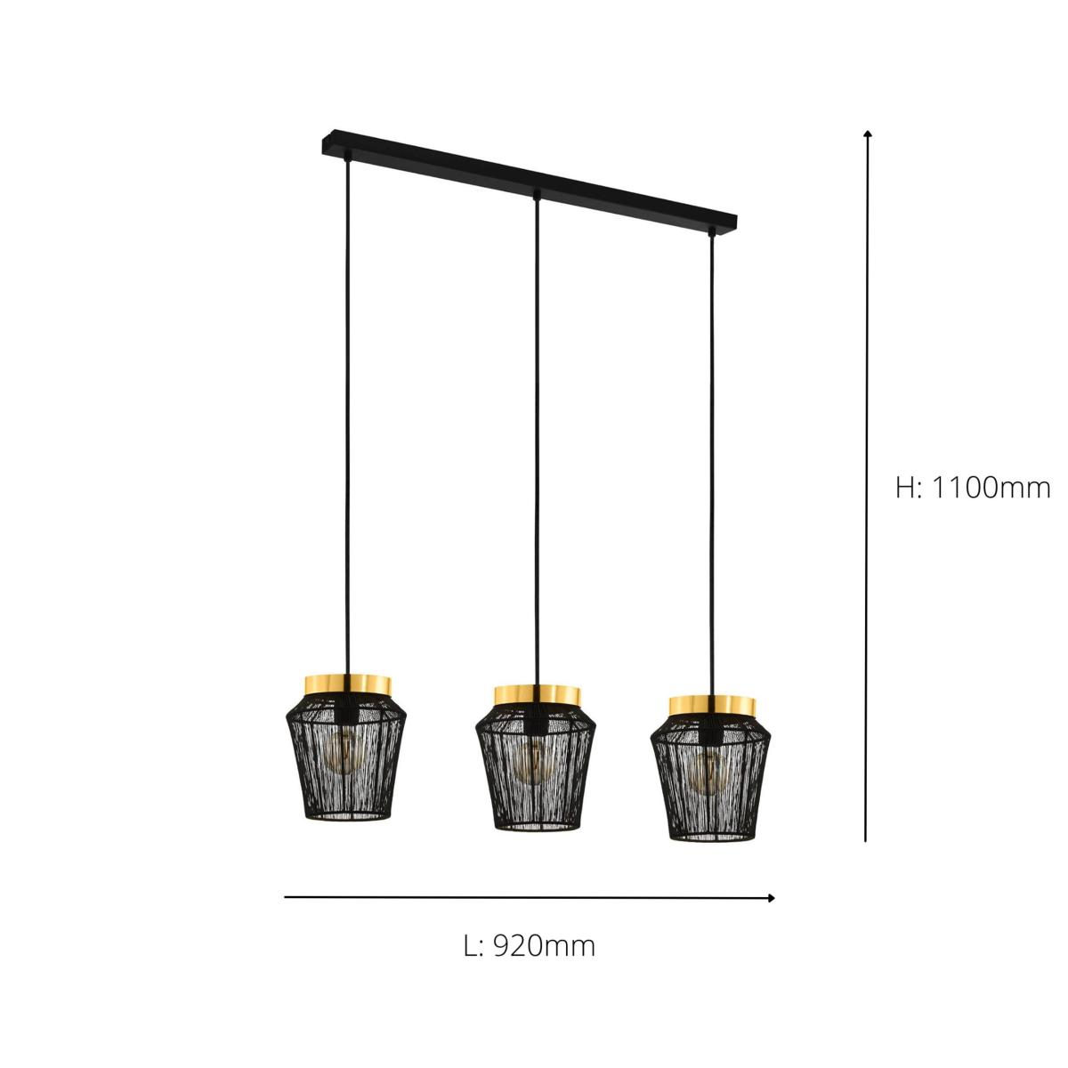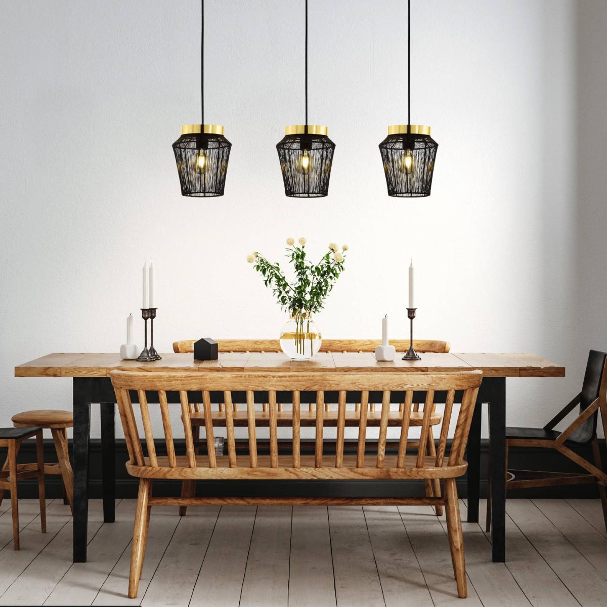 The Escandidos pendant light features three handcrafted lampshades wrapped with fine wire threads. The brushed brass detailing complements the pendant light’s unique look and will add a metallic touch to any interior. The ornate wire threads create a fascinating play of light and shadow when the light is on. The shades are suspended from the rectangular black canopy with high-quality black textile cables. With a distinctive design, this pendant light blends with any interior and provides stylish lighting for the living room or above the dining room table. The product has E27 lamp holders and requires 3 x E27 lightbulbs, which are not included.