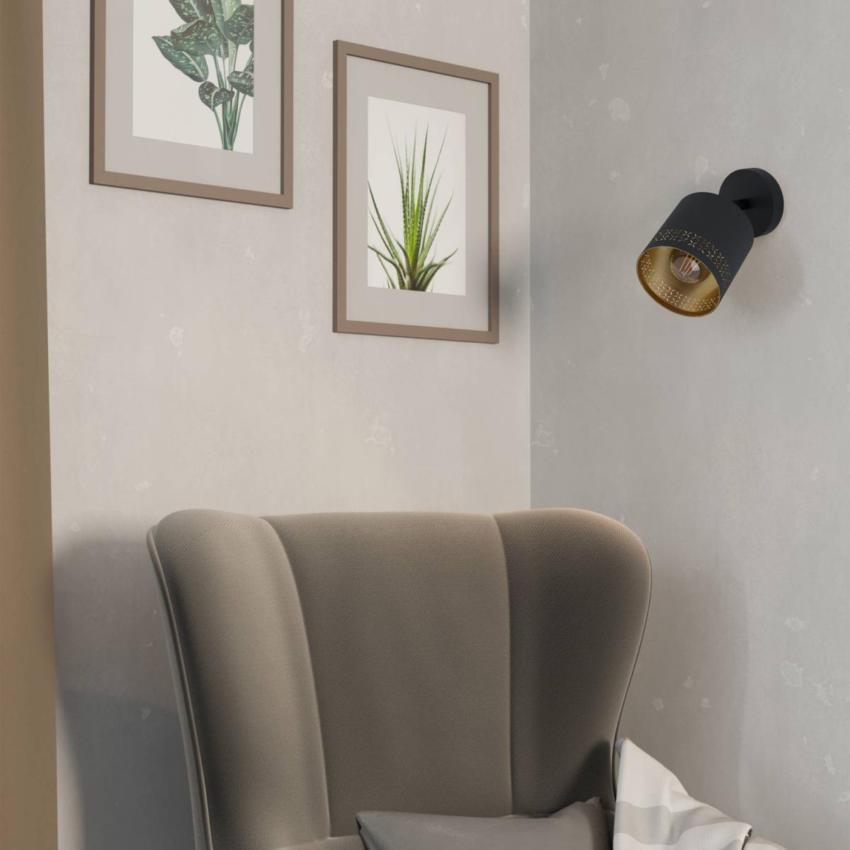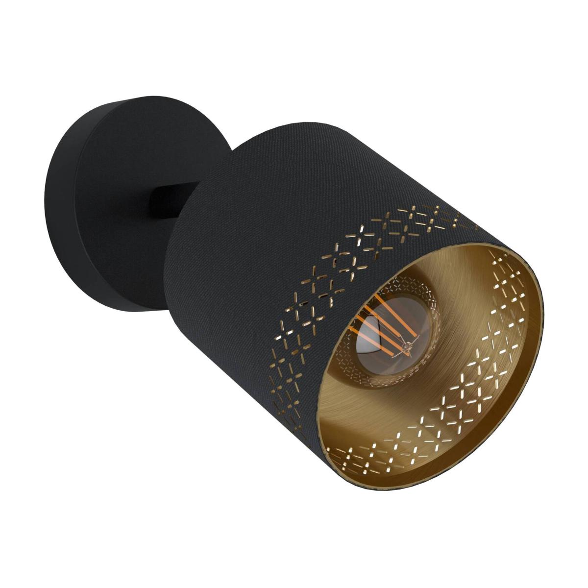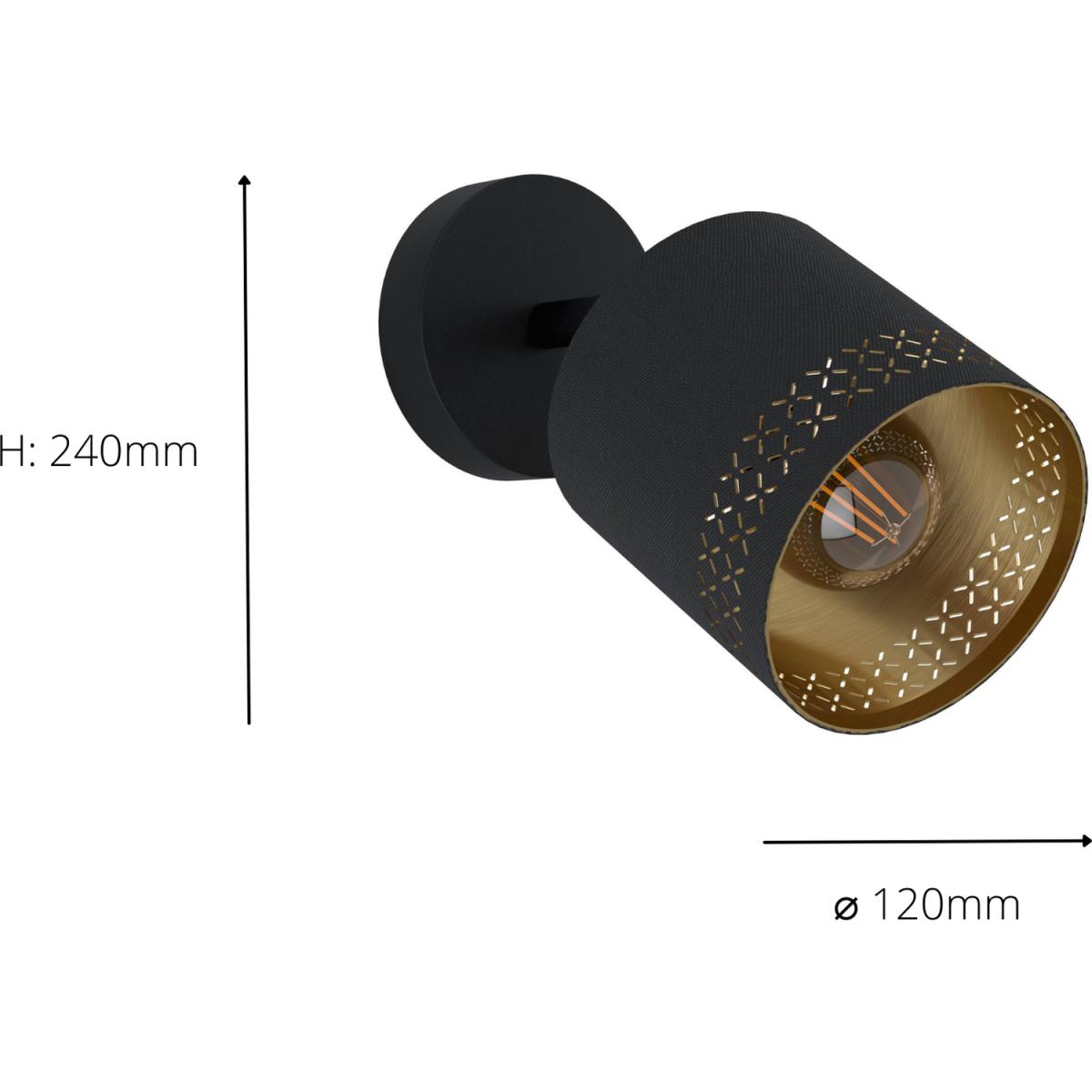 The ESTEPERRA wall and ceiling light is made from black metal and has an adjustable spotlight finished in black fabric with an inner gold lining. The small cut-outs around the edge of the lampshade create a fascinating play of light and shadow as soon as the light is on. The wall-mounted spotlight blends with almost any home interior and can be used as a ceiling light. The pivoting head allows you to adjust the light to accentuate individual areas of the room, whether in the living room, the bedroom, the hallway or the dining room. The product requires an E27 lightbulb that is not included.