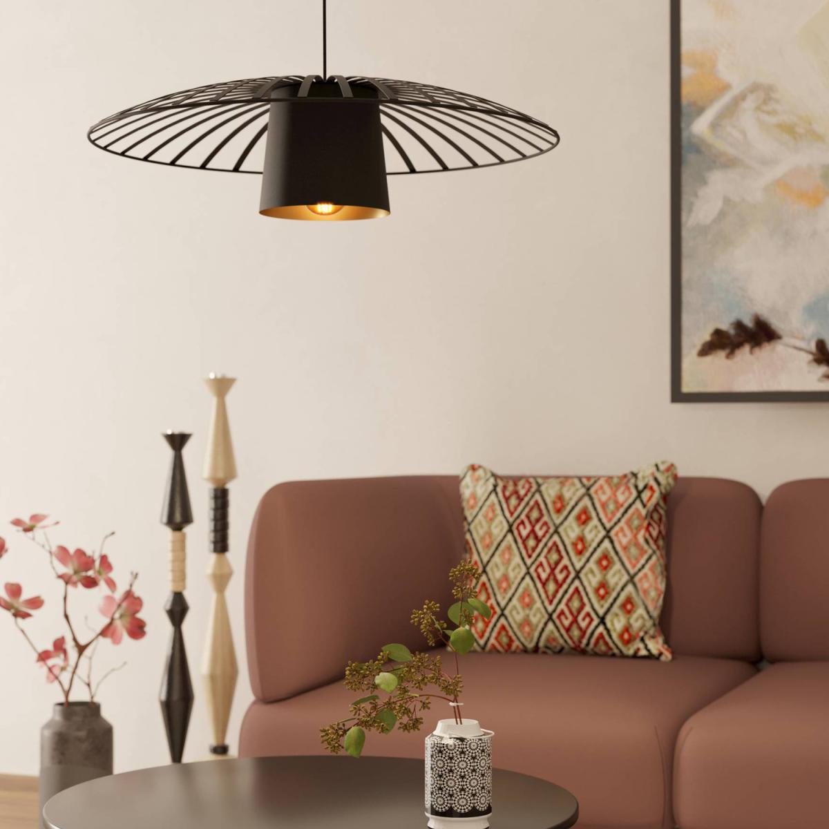 The FELIXKIRK pendant light has a round black flat metal lampshade with an inner metal cylinder. The black metal shade has a gold-coloured inner surface, which creates pleasant lighting. The pendant light superbly complements modern Japanese-style interiors and will create the right mood in any space, whether in the living room or dining room. The product has an E27 lamp holder and requires 1 x E27 lightbulb, which is not included.