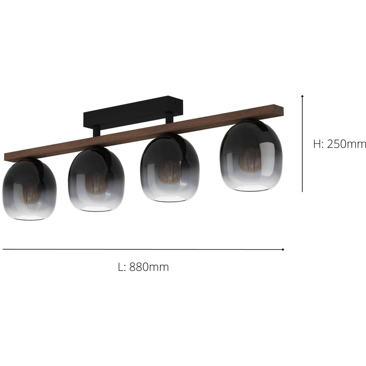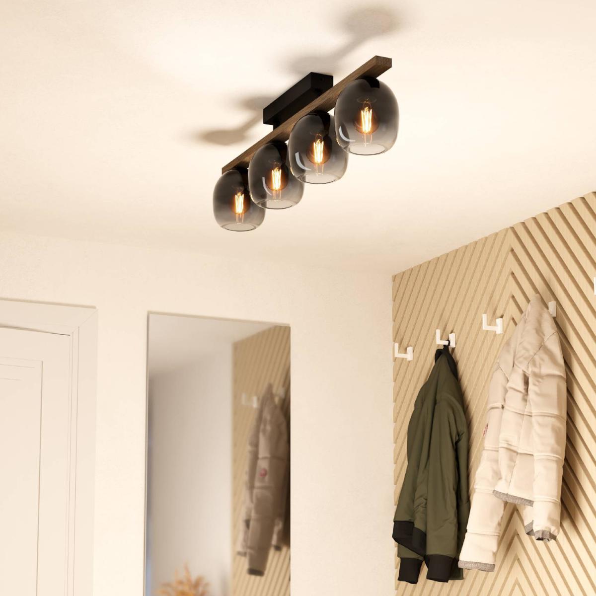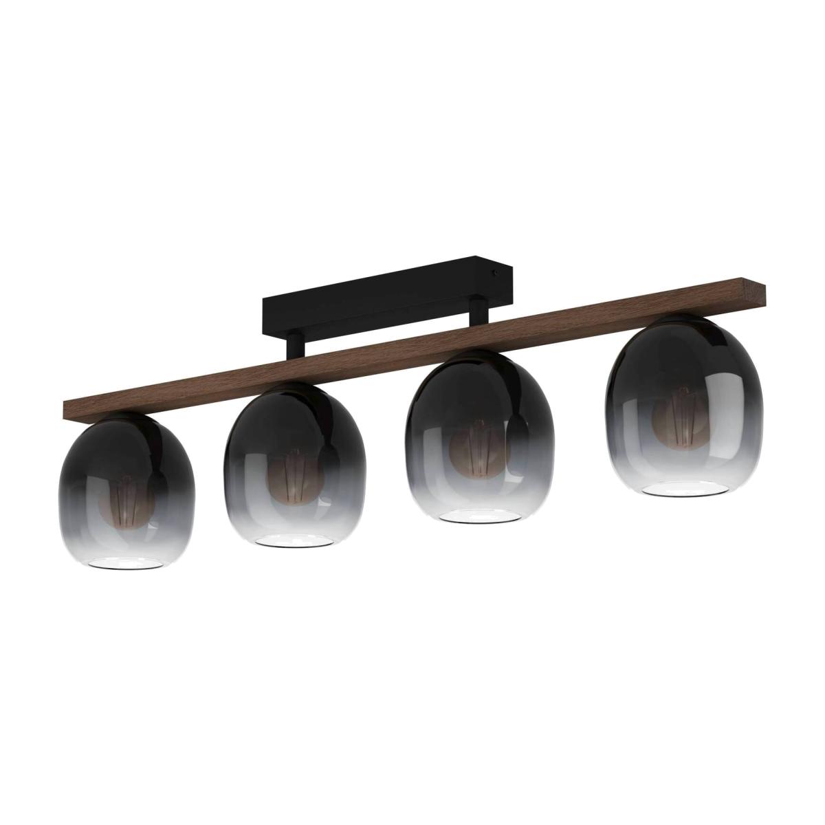 The FILAGO ceiling light features a pinewood beam in walnut brown combined with four round glass lampshades that fade from black to transparent. The black metal base beautifully complements the ceiling lights elegant look. The product blends seamlessly into modern interiors, providing welcoming lighting in any space, whether in the kitchen, living room, bedroom or hallway. The product has E27 lamp holders and requires 4 x E27 lightbulbs, which are not included.