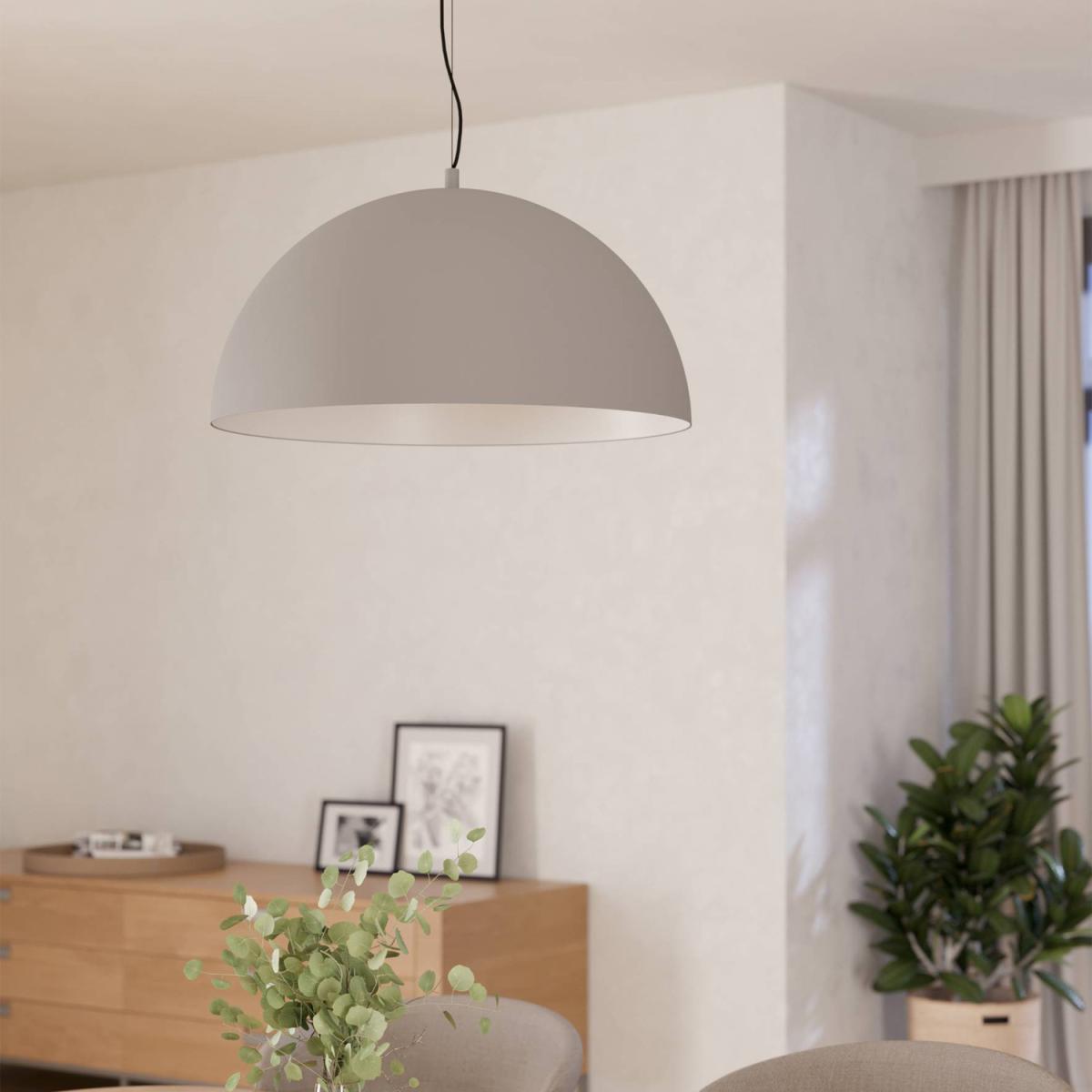 The GAETANO 1 single pendant light features a statement metal grey lampshade with a large dome design. The round lampshade is complemented by a white inner finish, a black ceiling mount and a stylish textile cable. With its versatile design, the GAETANO 1 pendant light seamlessly complements various interior styles, becoming a focal piece in any setting. The diameter of 50cm makes this pendant light the perfect choice above the dining room table or kitchen island. The product has an E27 lamp holder and requires an E27 lightbulb, which is not included.