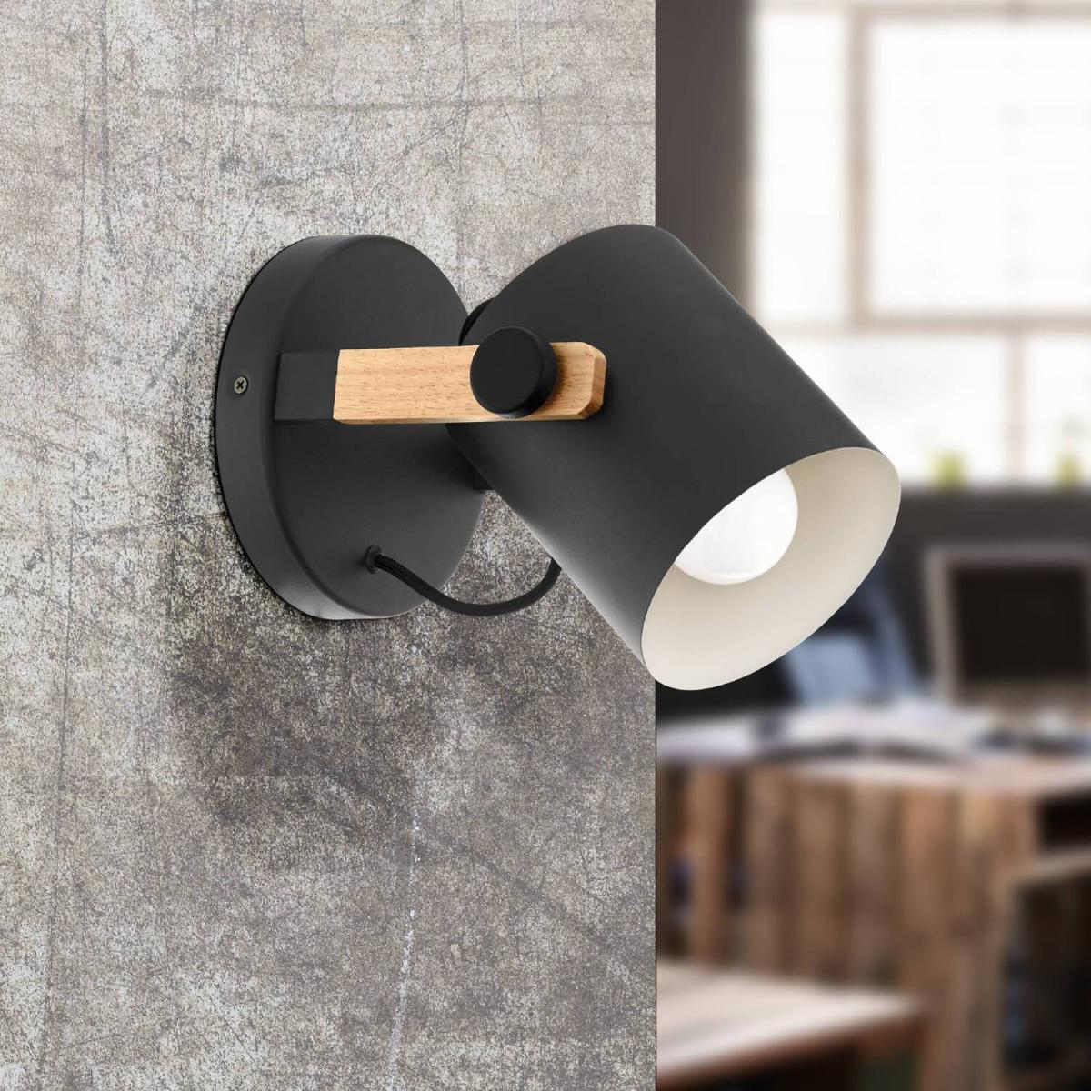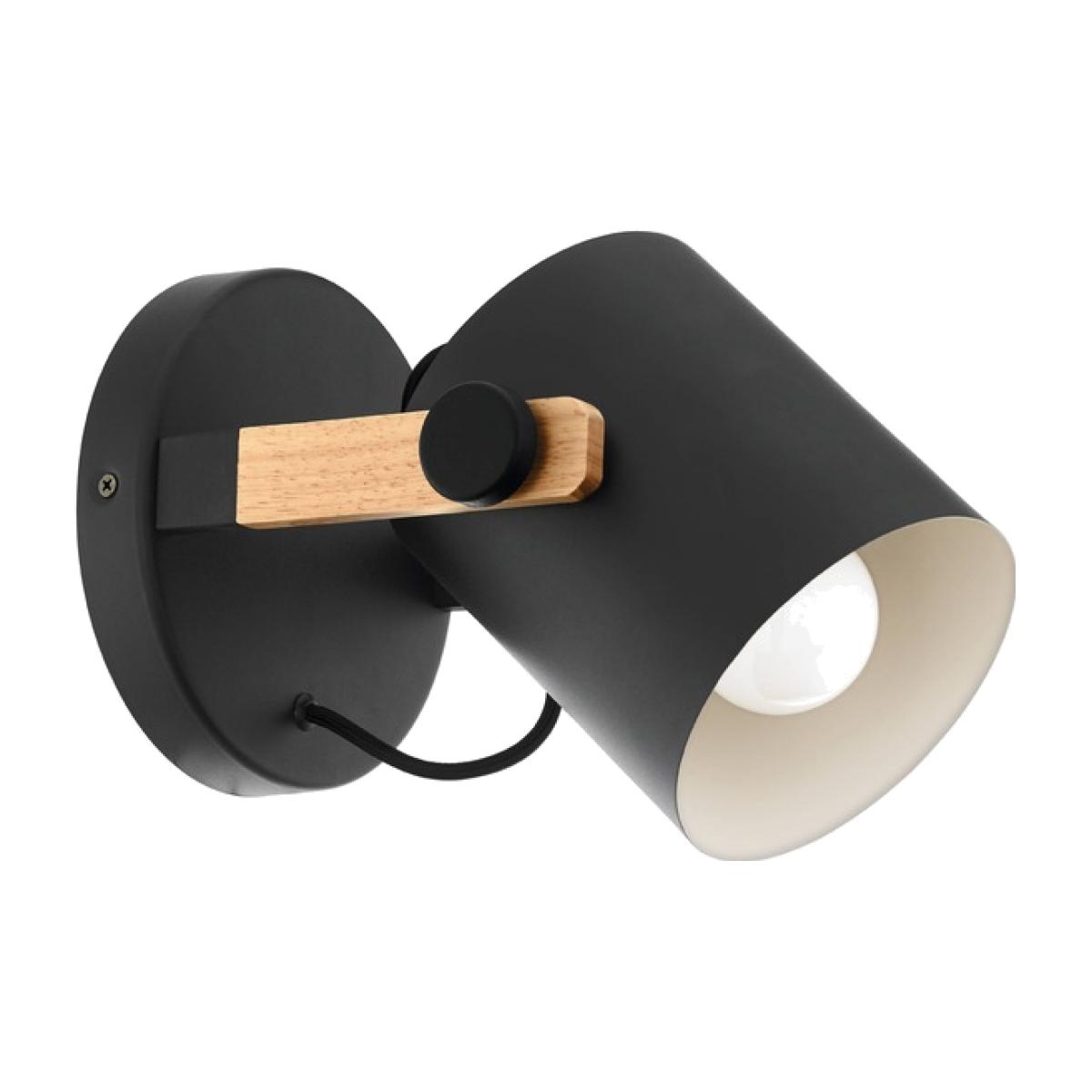 Retro-style wall lamp with a circular base and black steel finish. The fitting has wooden accents suspending a cylindrical spotlight with inner white steel shade to add vintage charm and directional light to your home.