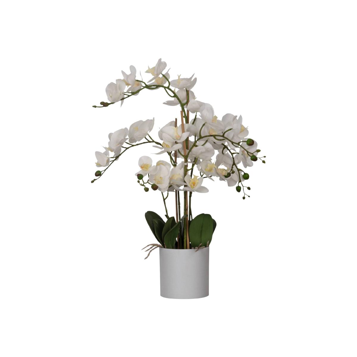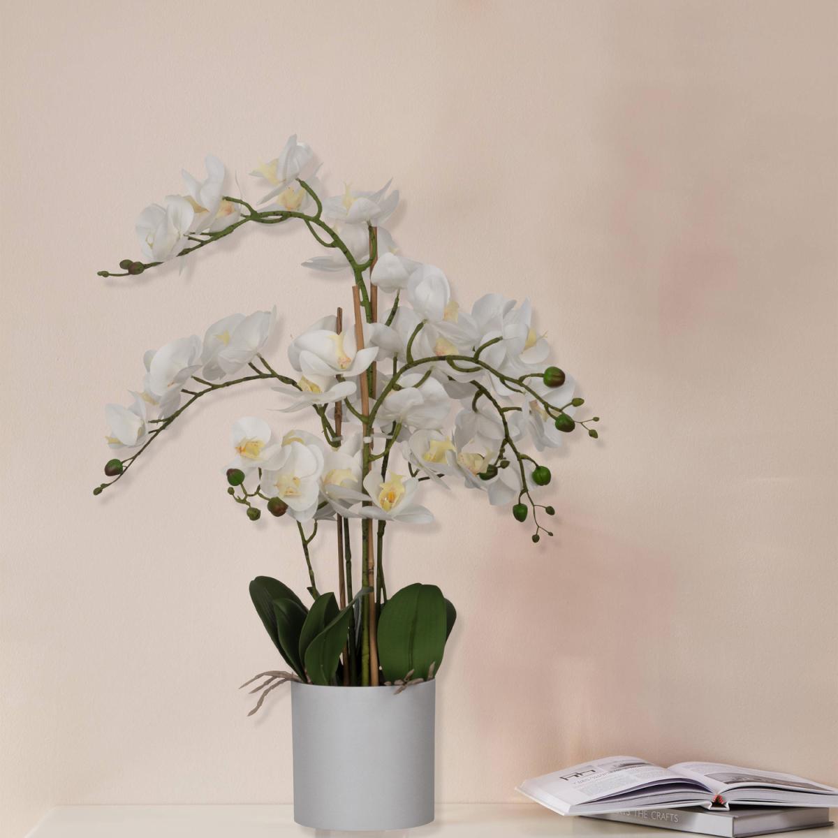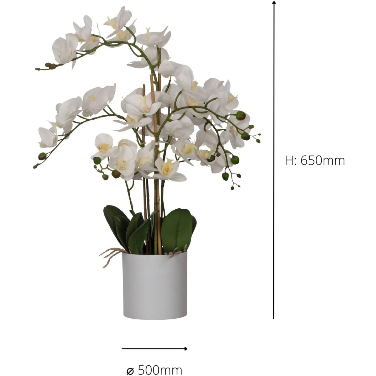 The HYUGA artificial orchid plant will brighten your living area with vibrant green accents and floral tones. The synthetic plant has a realistic look and comes in a decorative pot made of speckled grey plastic with faux soil, ensuring you can add nature themes throughout the home without needing the upkeep of a living plant. The design combines lifelike details, durability, and functional materials in a single product. The plant measures 65 cm in height and will work best placed on an uncluttered table, side cabinet, or shelf.