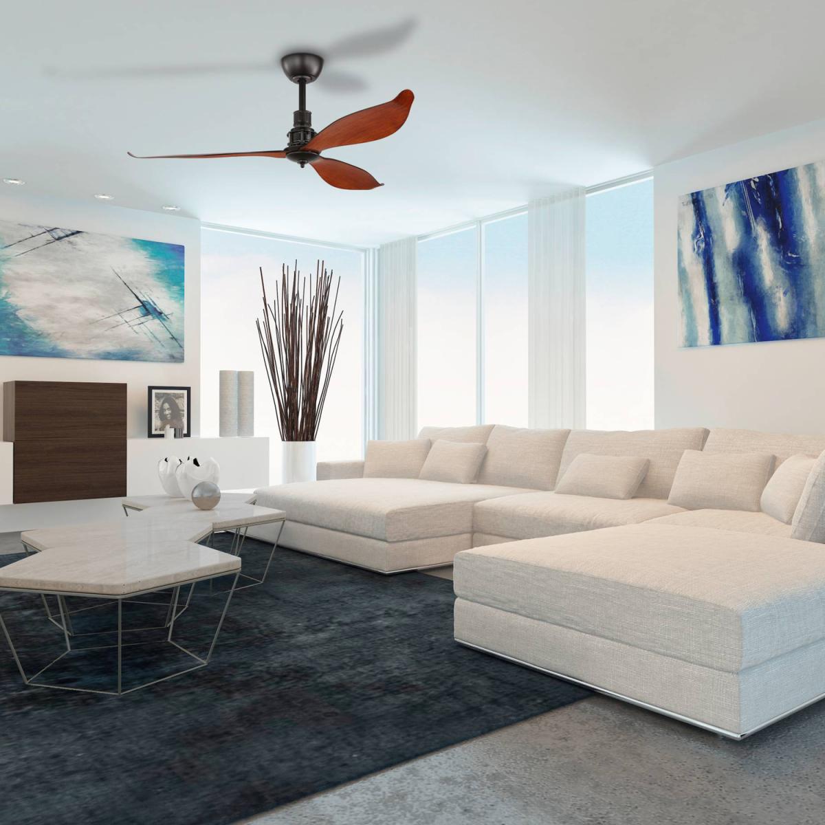 The LAGOS 52 ceiling fan features a matte black steel body and has three blades made of premium ABS plastic in a reddish-brown wooden finish. The product includes a remote control, allowing you to select one of the five different speed settings, operate the timer, and switch between summer and winter modes. The direction of rotation is reversible (summer and winter mode), so the fan is used all year round to keep the room at a comfortable temperature. The built-in DC motor is energy-efficient (airflow-power ratio 8.95 ((mmin)W)) and runs almost silently, making the product suitable for bedrooms. With a diameter of 132 cm, this striking ceiling fan is ideal for rooms measuring between 20 and 27 m2. The product can be mounted on ceilings that slope at an angle of up to 13.