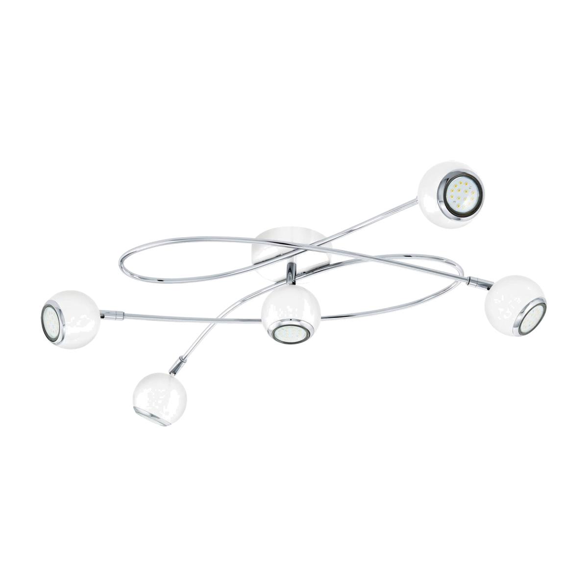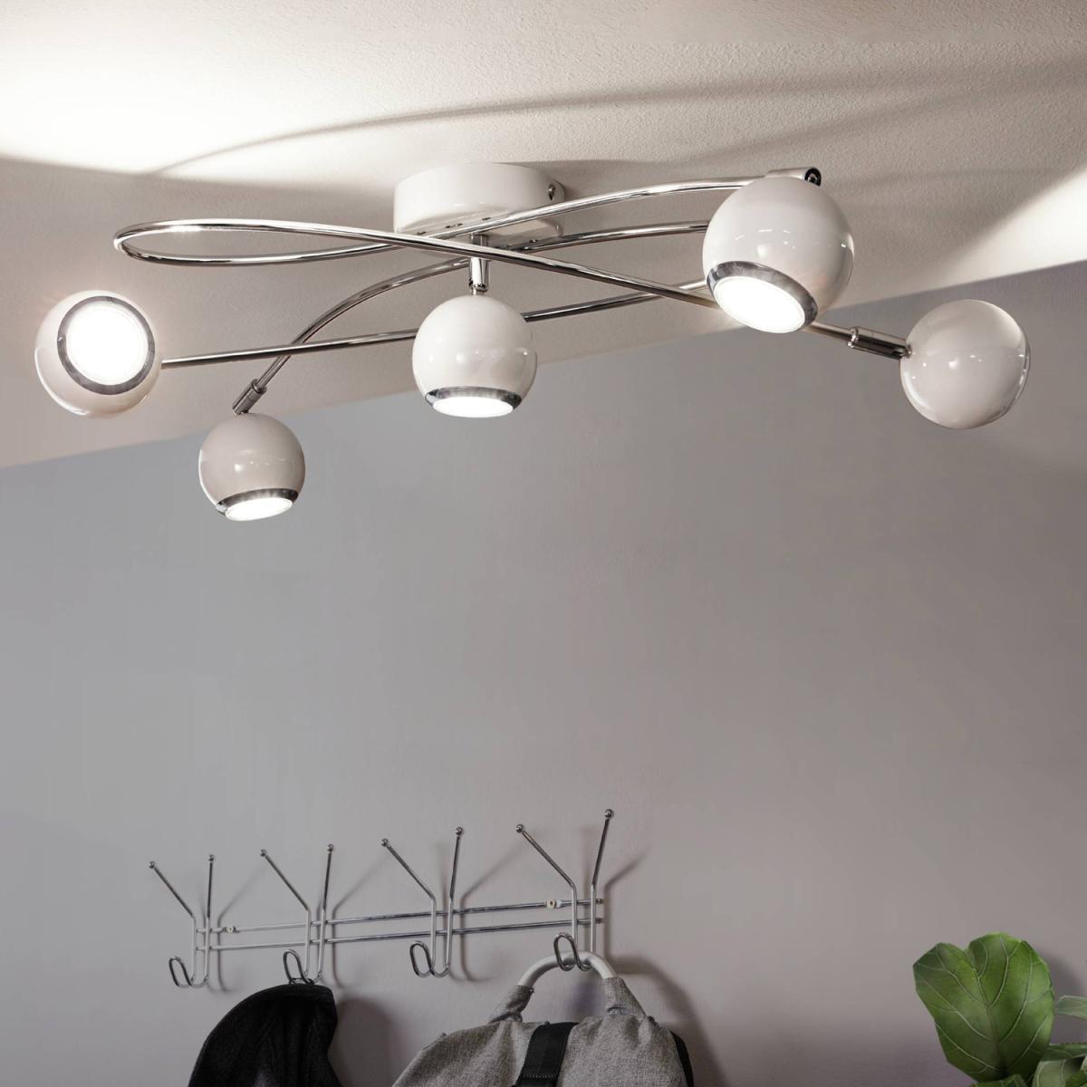 The LOCANDA LED ceiling light features a round metal base in a white finish with two chrome-coloured curved arms. These are combined with five adjustable, spherical spotlights in a white finish with chrome-coloured details. With its pivoting heads, the modern ceiling spotlight provides focused lighting, whether its in the kitchen, living room, bedroom or hallway. The product includes 5 x GU10 lightbulbs, which produce a pleasant warm white light.