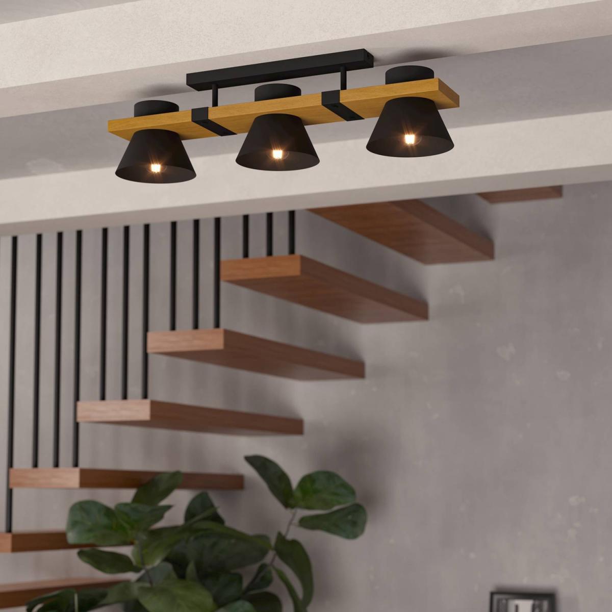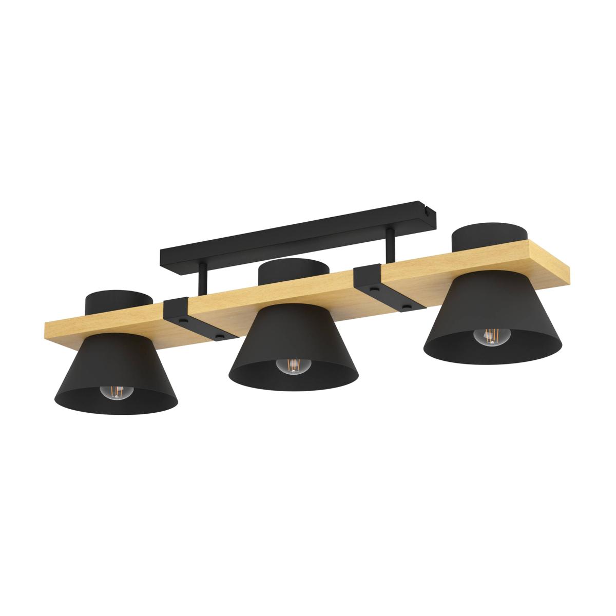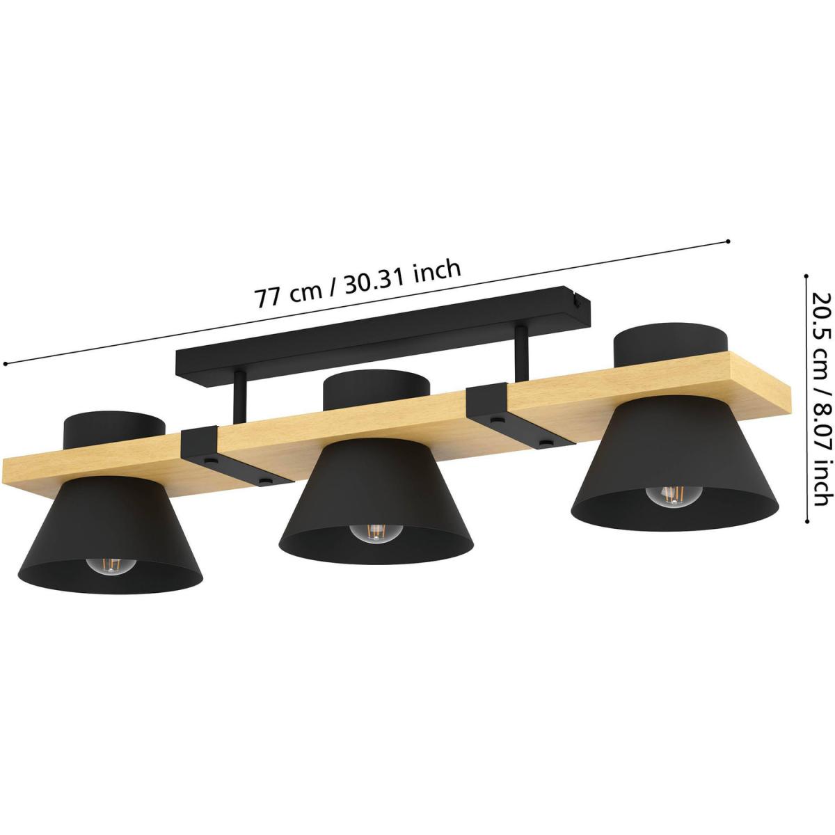 The MACCLES ceiling light features a modern design of metal and natural materials, with black steel lampshades attached to wooden elements. The black steel clasps and buttons form beautiful details and underline the industrial style. The ceiling light complements both modern and industrial-styled interiors, providing stunning downward lighting for the living room, bedroom, hallway or dining room. The product requires 3 x E27 lightbulbs, which are not included.