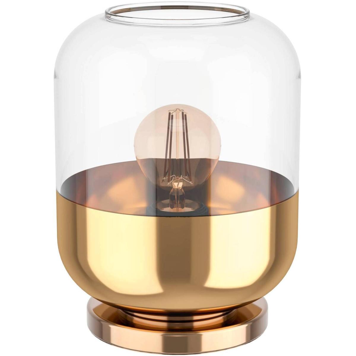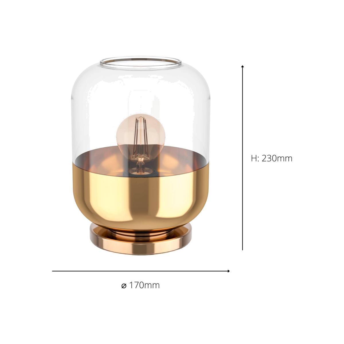 The Maryvilla is a modern table lamp featuring a rounded glass lampshade and gold metallic detailing. Enhance the visible lightbulb style with a dramatic lightbulb to enhance the statement look. The table lamp adds a touch of Art-Deco charm to your interior and compliments a modern or minimalist home with its sophisticated look.