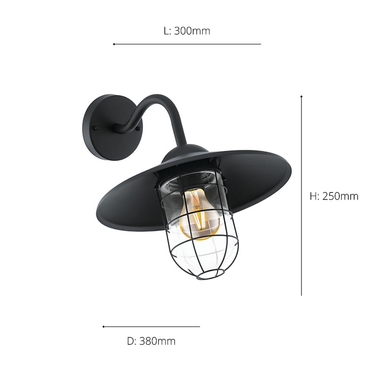 The Melgoa is an exterior wall light with a sleek black zinc-plated steel finish and clear glass shade. The product has a circular base with a curved arm and a flat shade with a caged design. This style of exterior light exudes industrial charm and would compliment both rustic and contemporary gardens alike. The product requires 1 x E27 illuminant and would look great with a retro-style lightbulb to maximise the vintage feel.