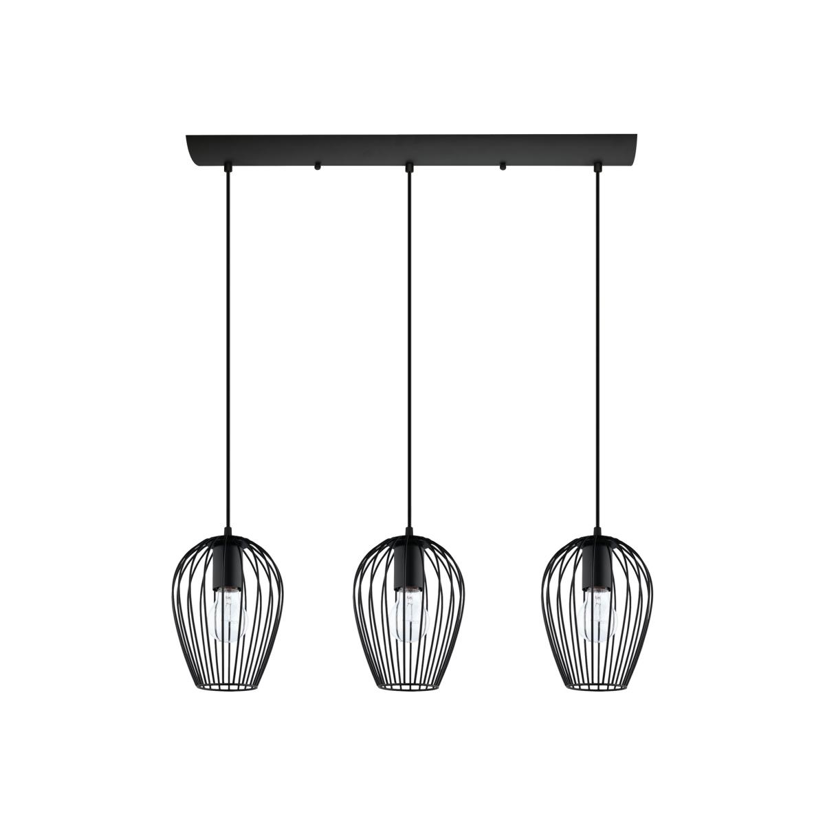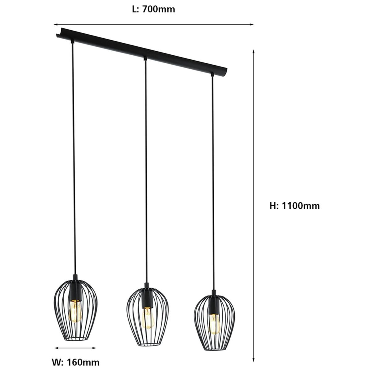 The Newtown pendant light features three oval black wire lampshades suspended from a black metal canopy. Due to the wireframe design, the lampshades create a fascinating play of light and shadow as soon as the light is on. The pendant light blends seamlessly into modern interiors, creating the perfect lighting in any space, whether in the kitchen above the breakfast bar or the dining room above the table. The pictured filament lightbulbs are not included. Dimensions: Size H110, W16, D70cm. Diameter 16cm. Non-adjustable drop. 110cm drop. Bulb Information: Bulbs required 3 x classic E27 edison screw (not included). Recommended maximum wattage: 60 watts. Can not be used with a dimmer switch. General Information: Steel. IP rating 20. Minimal assembly. Product is hard-wired into electrics. This lighting product is a class 1 fitting. Manufacturer's 5 year guarantee.