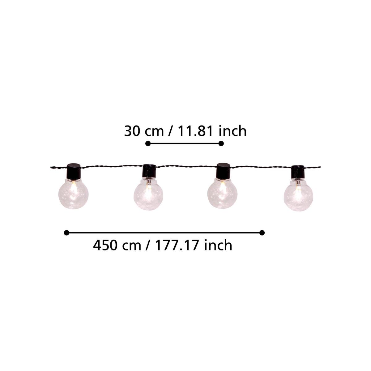 * Stylish Design* Features 4.5 Metre Cable* 16 Clear LED Bulbs* Warm White Glow* Easy Installation - Attached Hooks* IP44 Protection Rating Meet the EGLO Partaj 16 LED Indoor Outdoor String Lights – your ideal companion for crafting a warm and festive atmosphere, whether indoors or outdoors. Featuring a stylish 4.5 metre cable, these string lights showcase 16 clear LED bulbs spaced 30 centimetres apart, creating a delightful and enchanting glow. With an additional 5 meters from the plug to the first bulb, flexibility in installation is key. The pleasant warm white light emitted by the clear LED lamps adds a magical touch to any setting, making it perfect for your terrace, balcony, or a cosy indoor nook. Installation is a breeze, with each light bulb equipped with attached hooks. Designed with an IP44 rating, these lights offer splash water protection, ensuring durability and making it an excellent choice for outdoor use.