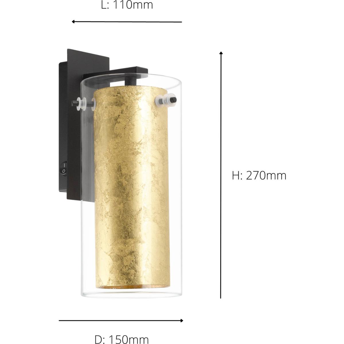 The PINTO GOLD wall light features a cylindrical glass lampshade with a gold finish and a black steel wall mount. The inner glass body has a gold leaf-style finish that allows the elegant character of the light to shine through and produces a warm glow once illuminated. The wall light operates by a rocker switch located on the wall mount. The design works well with almost any interior style, providing modern lighting in the bedroom, living room or hallway. The product has an E27 lamp holder and requires 1 x E27 lightbulb, which is not included.
