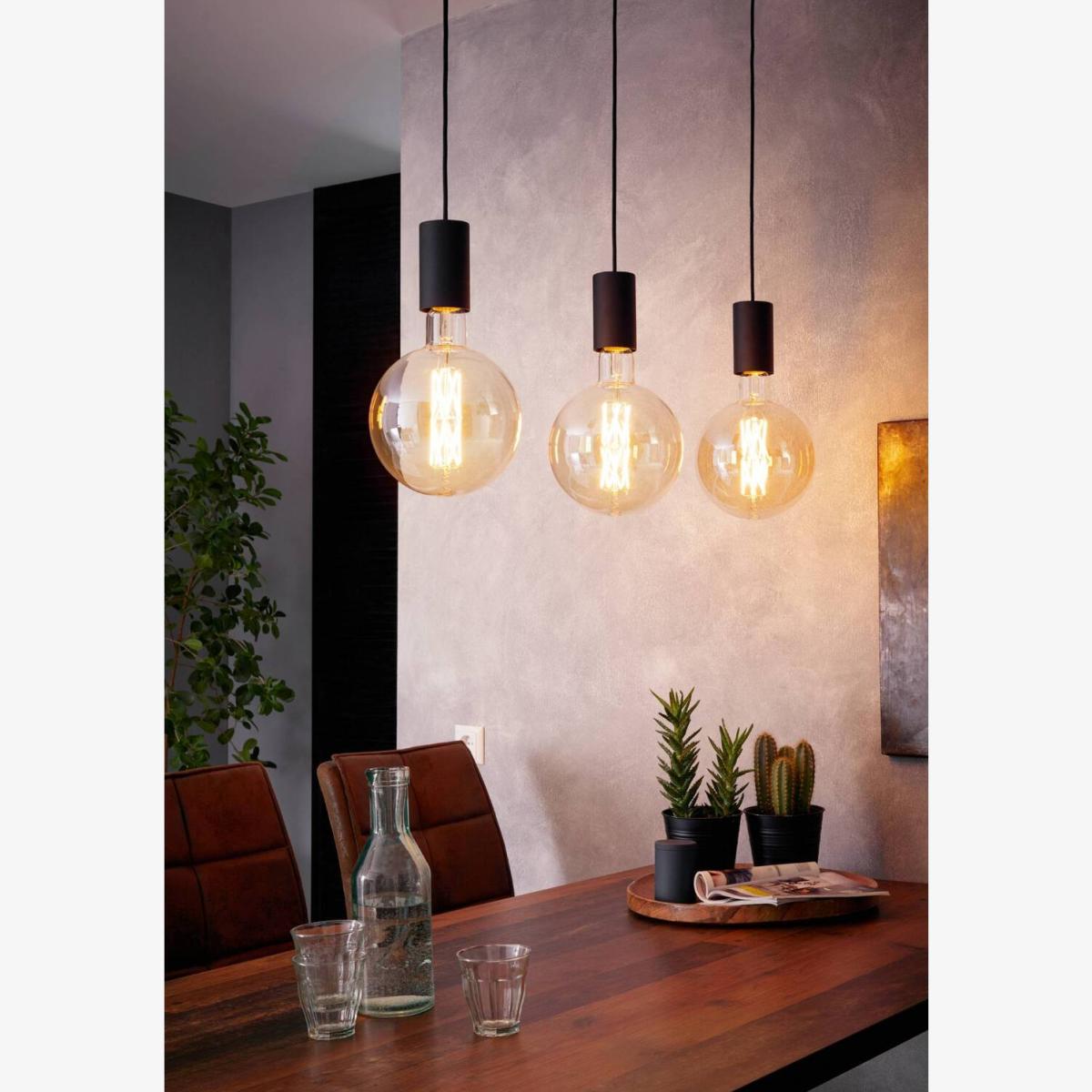 The POZUETA pendant light features a black steel canopy and three lamp holders, hung from black textile cables. The product has a minimalist look and a visible lightbulb design that complements modern and Scandinavian interiors, providing striking ambient lighting for any space, whether in the living room or over a long table in the dining room. The product has E27 lamp holders and requires 3 x E27 lightbulbs, which need to be purchased separately.