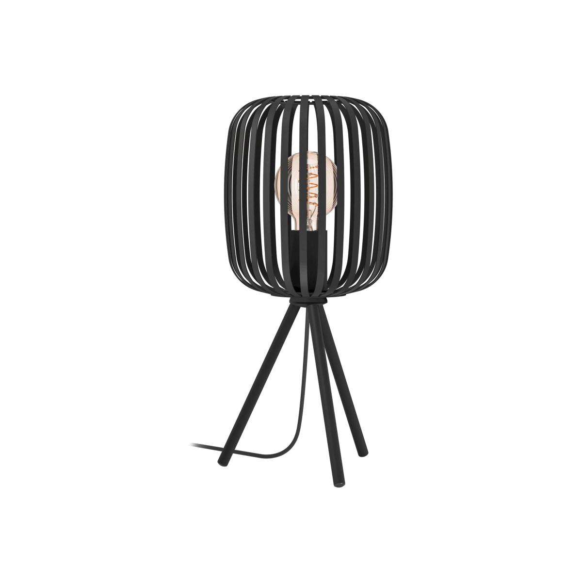 Add modern style to your home with this striking table lamp, featuring a caged lampshade with a black finish and a tripod base. The table lamp has a semi-visible lightbulb, which produces a dramatic lighting effect when illuminated. The table lamp is a
