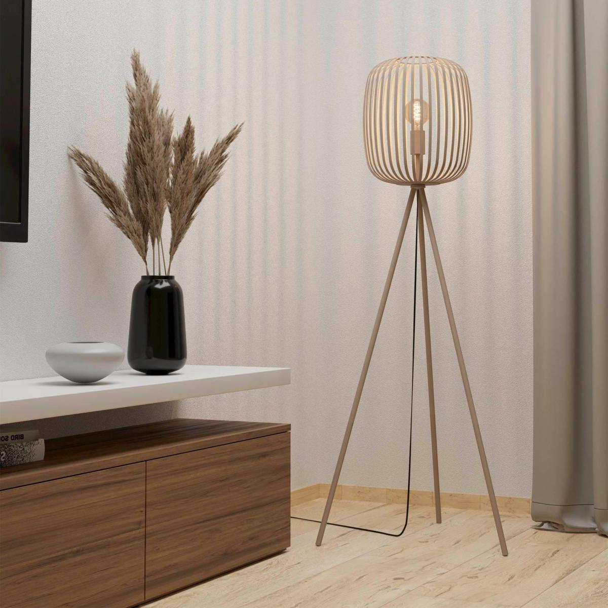 * Stylish, Industrial Look & Design * Tripod Base * Requires: E27 Cap Type * Available in Multiple Colourways EGLO's Romazzina Tripod Floor Lamp adds modern style to your home with its striking design. Featuring a caged lampshade and a tripod base, this product has a semi-visible light-bulb element, which produces a dramatic lighting effect when illuminated.