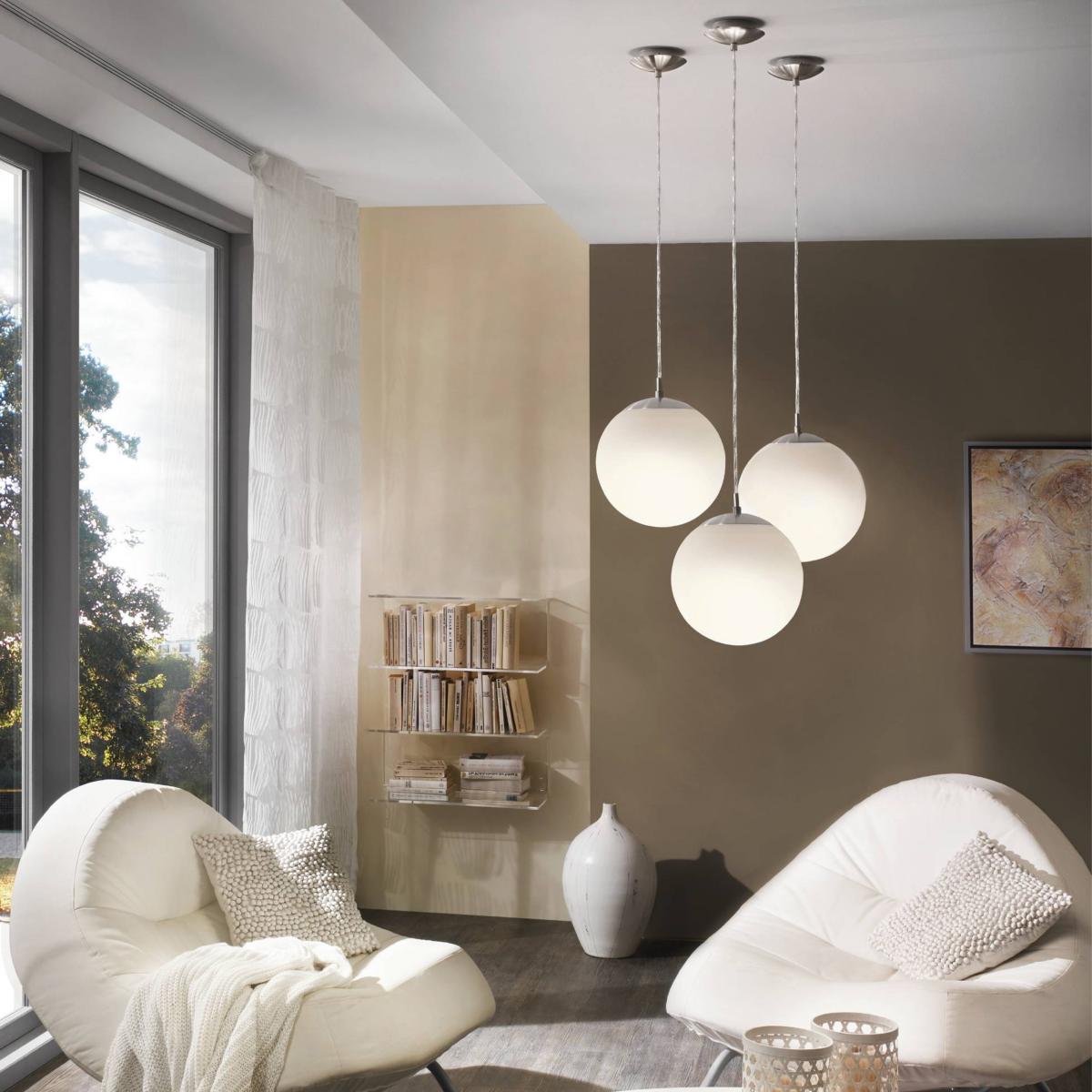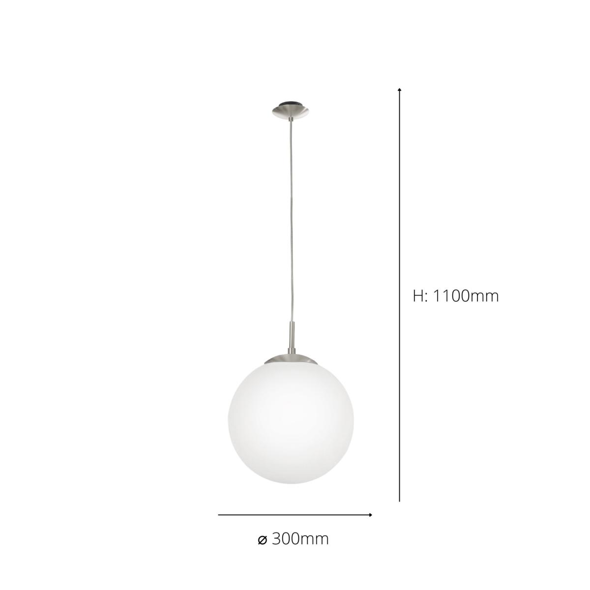 * IP44 rating* Requires 1 x E27 Bulb (not included)* Height Adjustable* 2 Year Guarantee The Rondo is a minimalist single pendant that draws inspiration from the Scandi design style. The design has a white opal matt glass globe lampshade and satin nickel detailing with a diameter of 30 cm. The Rondo is a simple but eye-catching pendant that produces a beautiful glow of light once illuminated and would complement a minimalist, contemporary or Scandi interior.