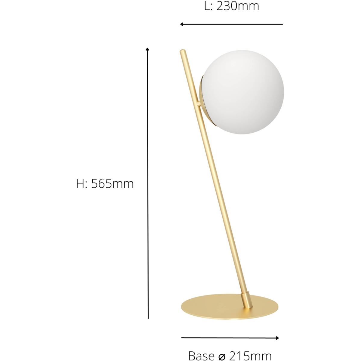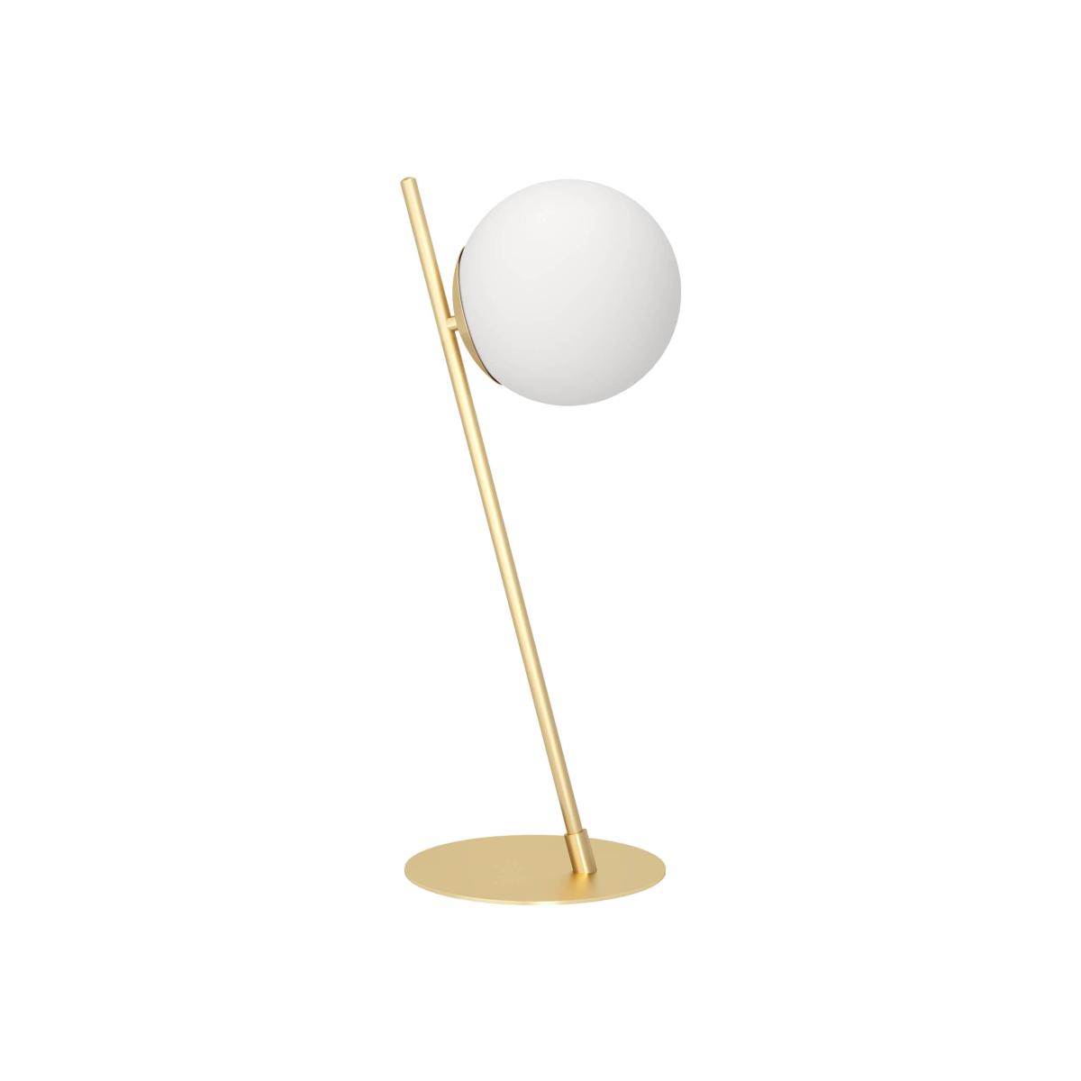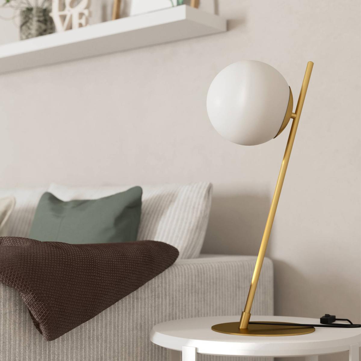 The RONDO 4 table lamp showcases a round flat metal base in brushed brass, artfully attached to a dynamic angled rod that supports an opal matt glass ball. Designed with sophistication in mind, the retro-inspired RONDO 4 table lamp seamlessly complements a wide range of interior styles, adding a touch of elegance to any setting. The in-line switch on the cable ensures ease of use, enhancing the lamp's practicality. Ideal for creating a refined ambience, this table lamp offers stylish illumination for various spaces, be it in the bedroom, living room, or accentuating the dining room. The product has an E27 lamp holder and requires an E27 lightbulb, which is not included.