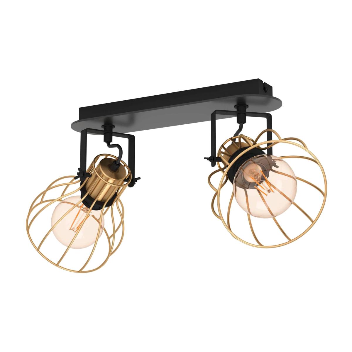 The product is a stylish ceiling spotlight featuring two caged lampshades with a brushed brass finish and a black steel mount. The spotlight has adjustable lamp heads and a minimalist look that compliments a modern or monochrome home. Enhance the exposed lightbulb look with a retro-style lightbulb to add drama. The product is the perfect lighting solution for the living room, bedroom, kitchen and hallway.