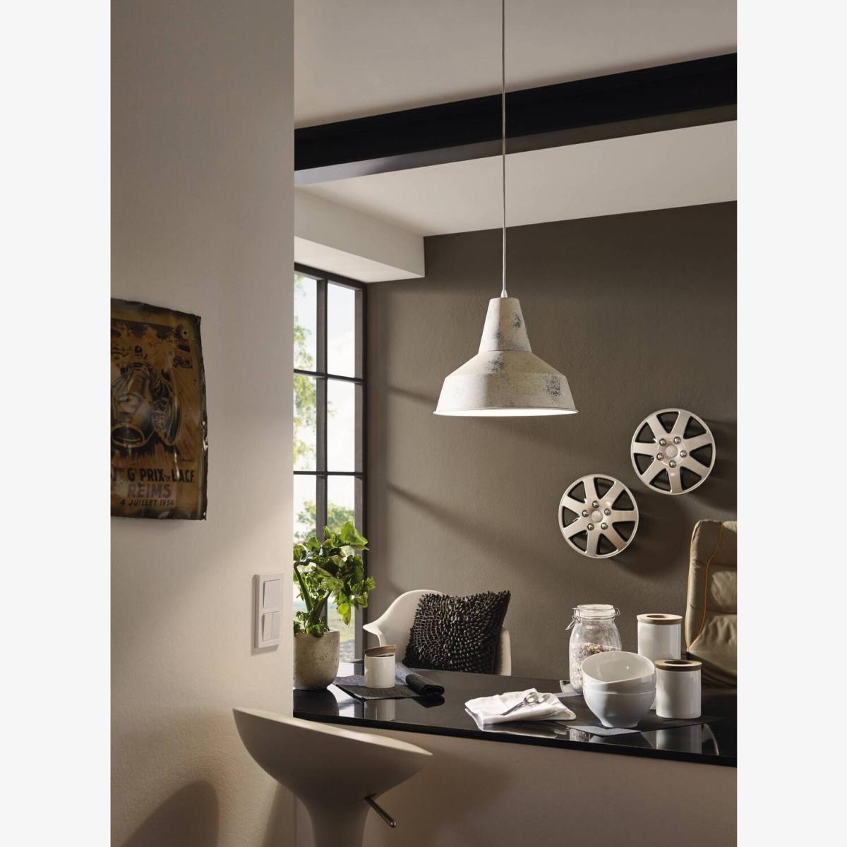 This pendant luminaire from the series SOMERTON is made of white-chalked steel. It features a traditional shade style with an industrial vintage white finish and a white inner shade. Made of steel, the ceiling pendant light is sturdy and durable. It complements industrial chic interiors for a vintage look. The spotlight needs an E27-lamp.