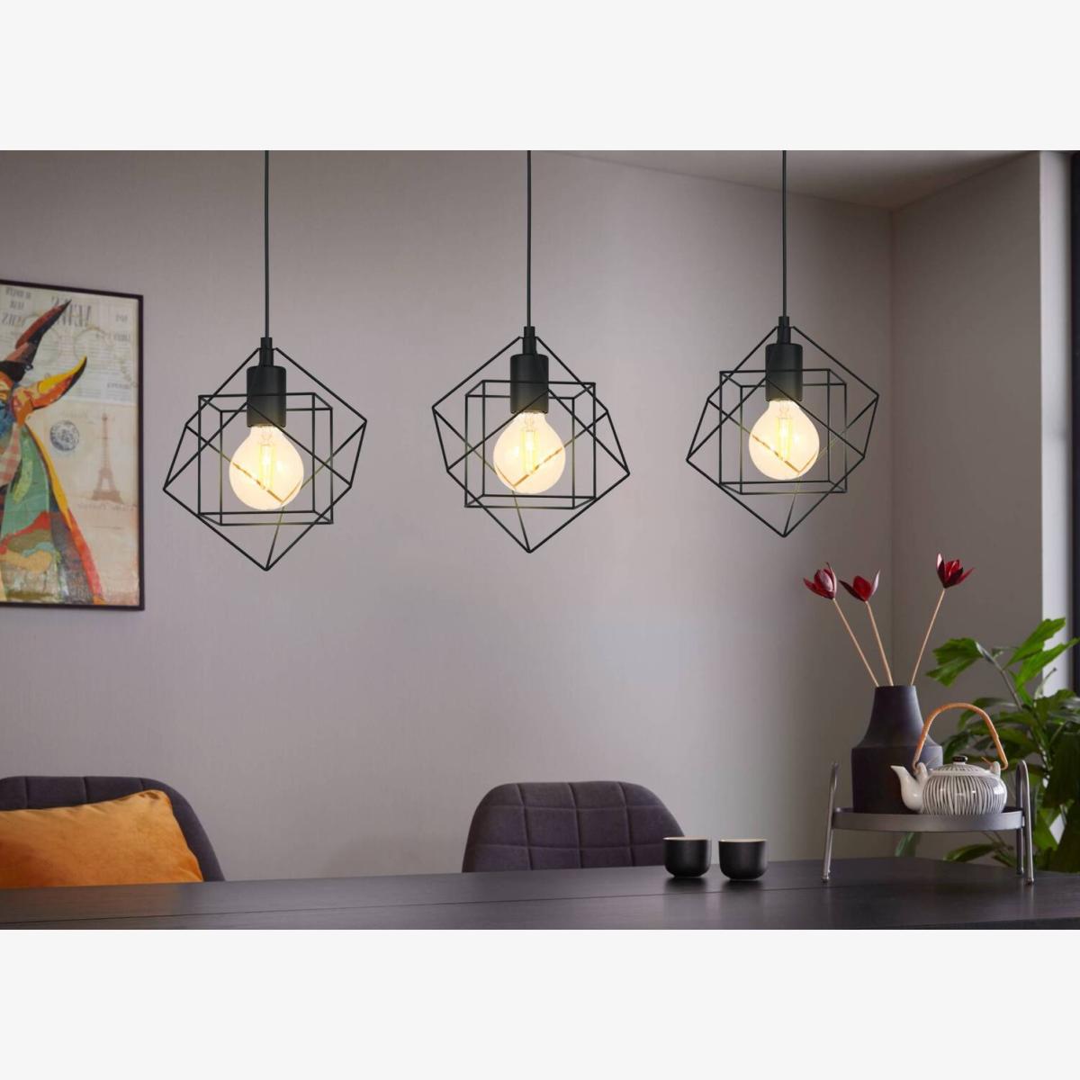The Straiton pendant light has three lampshades, each with two black square wire frames. The interlocking wire cubes create a fascinating play of light and shadow as soon as the light is on. The pendant light blends seamlessly with the vintage trend and modern interiors. The product offers stylish lighting, whether in the kitchen, in the living room or over a long table in the dining room. The pictured lightbulbs are not included. The product has E27 lamp holders and requires E27 lightbulbs.
