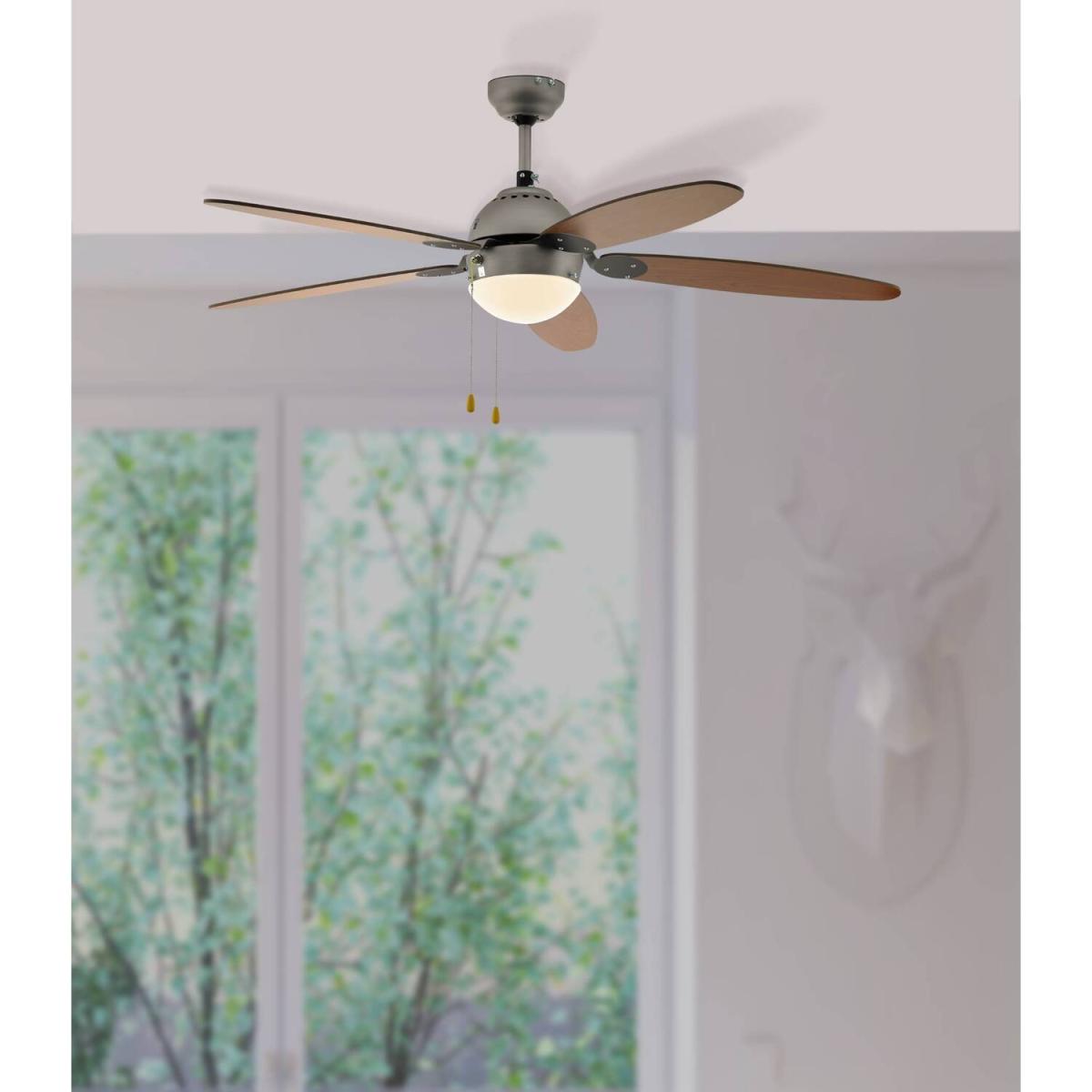 The Susale features five powerful blades, central illuminant and satin nickel finish. The product features a traditional design with contrasting red-brown wooden blades and satin nickel detailing. The ceiling fan requires an E14 illuminant and would compliment a traditional or modern home alike due to its versatile style.