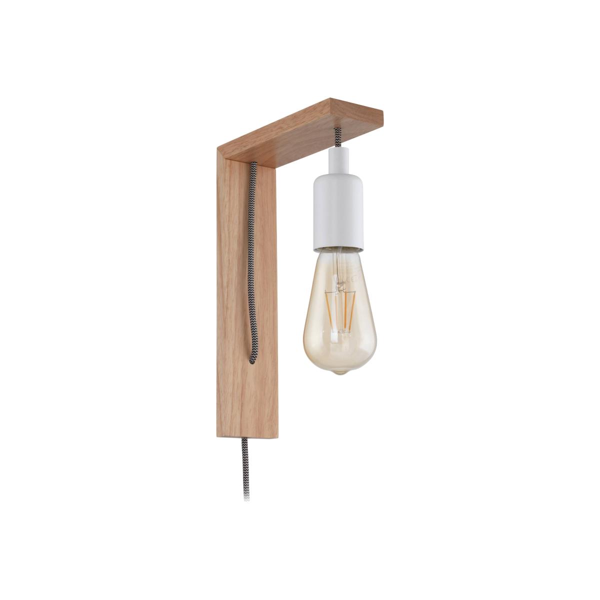 Plug-in wall light finished in wood and white. Style your home with this stylish wall light by Eglo. Featuring a quirky L-shaped, light wooden wall bracket with a black and white braided cable, this wall light conveniently plugs into any wall socket. Style this hanging white flex with a vintage bulb for an ultra modern effect. This light is perfect for rooms seeking a wall light solution without the need for an electrician. We think this light looks best with any of our E27 4w LED Vintage light bulbs for a rustic, warm glow.