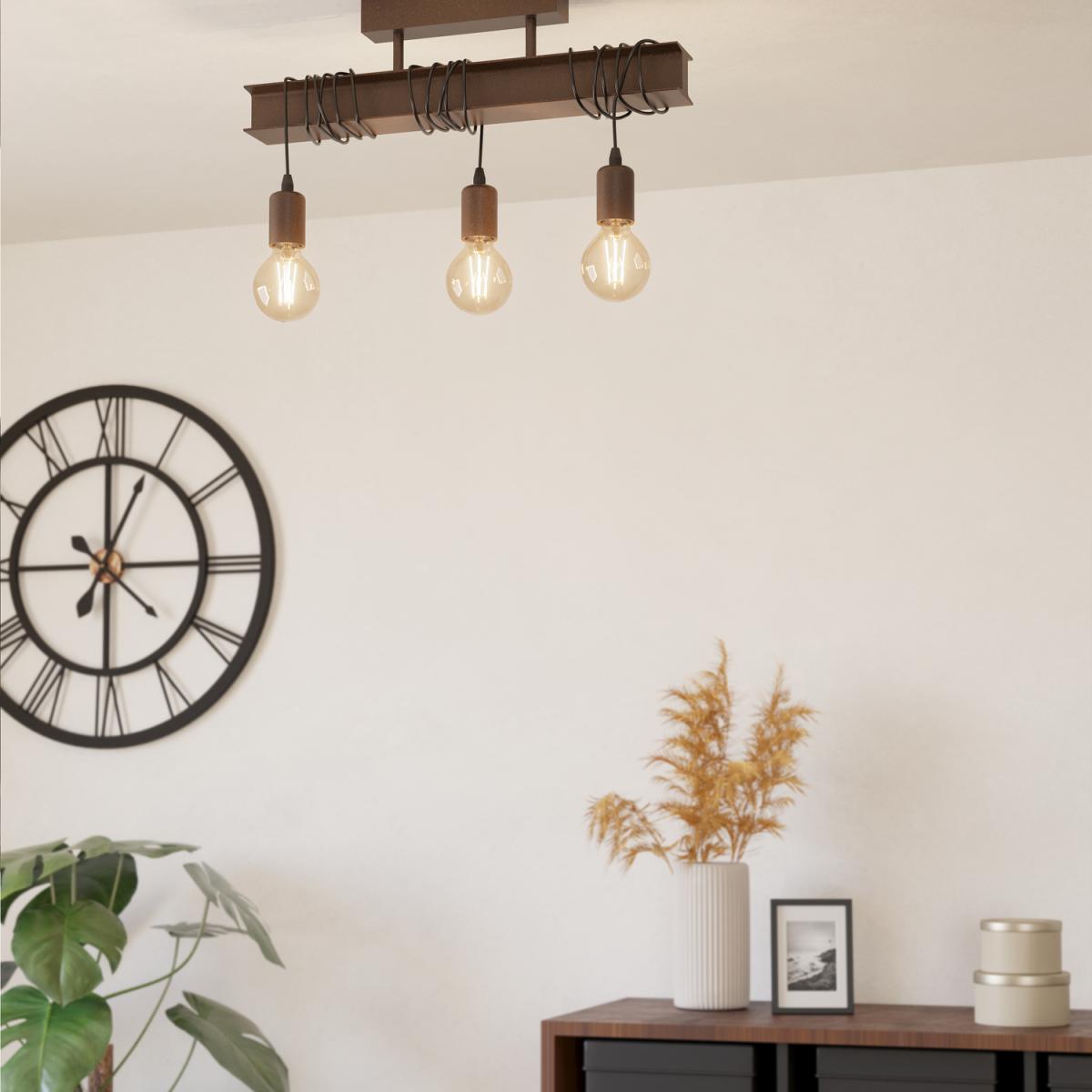 The Townshend 4 ceiling light features an antique brown metal beam and three antique brown lamp holders. The lamp holders are suspended at different heights and can be changed by winding or unwinding the ropes. With its industrial look, the ceiling light blends seamlessly into modern interiors and provides distinctive lighting for any space, whether in the kitchen, living room, bedroom, hallway or dining room. The pictured filament lightbulbs are not included. The product has E27 lamp holders and requires E27 lightbulbs.