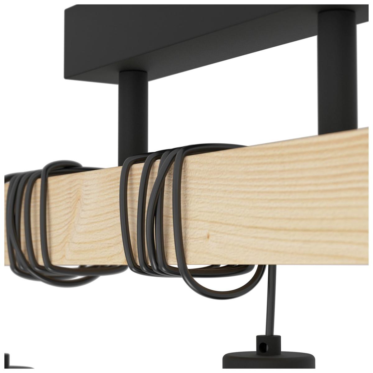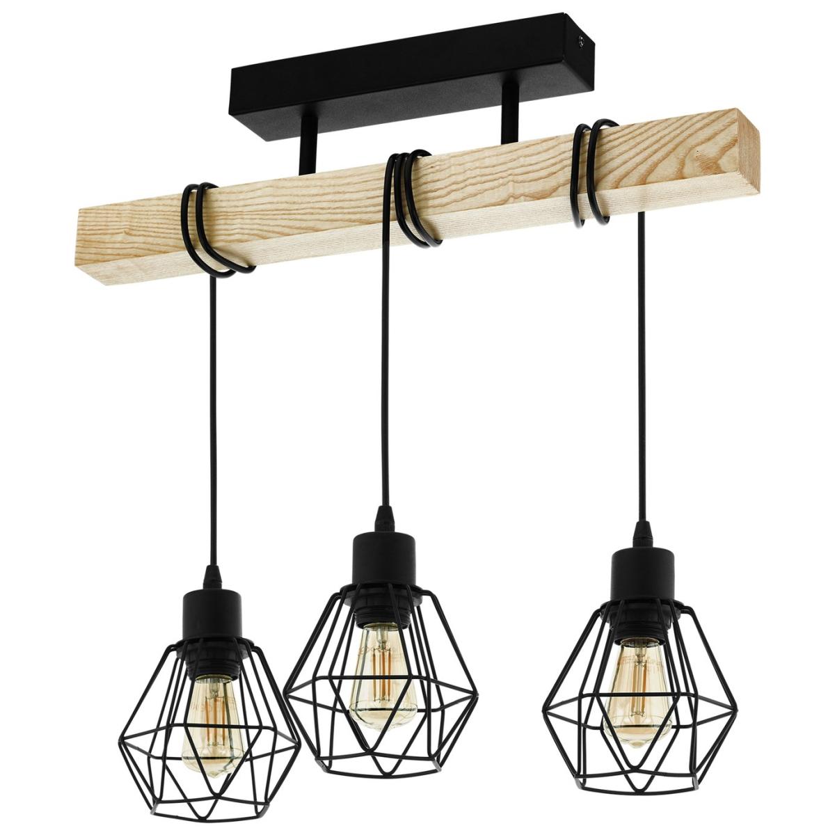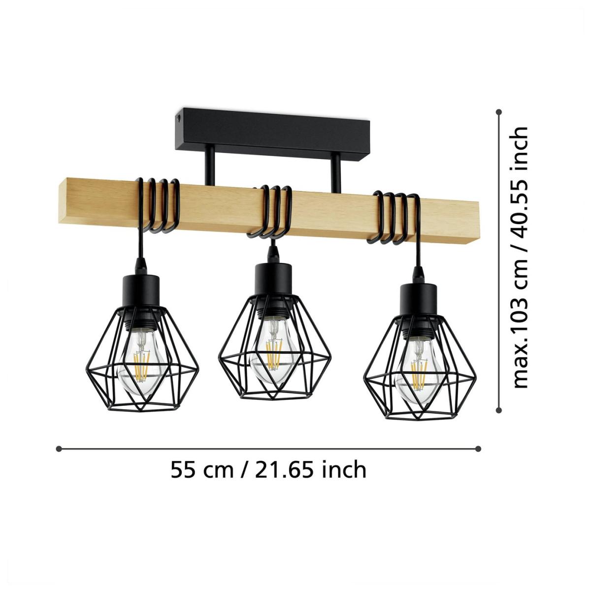 The Townshend 5 ceiling light features a wooden beam with three black wire lampshades. These geometric metal frames have an adjustable height simply by winding or unwinding the cables. With its eye-catching mix of pinewood and metal, the ceiling light blends seamlessly with interior design trends such as vintage and industrial. The product provides modern lighting for any space, whether in the kitchen, living room, bedroom, hallway or dining room. Dimensions: Size H36, W20, D55cm. Diameter 20cm. Non-adjustable drop. 36cm drop. Bulb Information: Bulbs required 3 x classic E27 edison screw (not included). Recommended maximum wattage: 60 watts. General Information: Steel & Wood. IP rating 20. Minimal assembly. Product is hard-wired into electrics. This lighting product is a class 1 fitting. Manufacturer's 2 year guarantee. FSC certified meaning the materials used for this product are responsibly sourced.