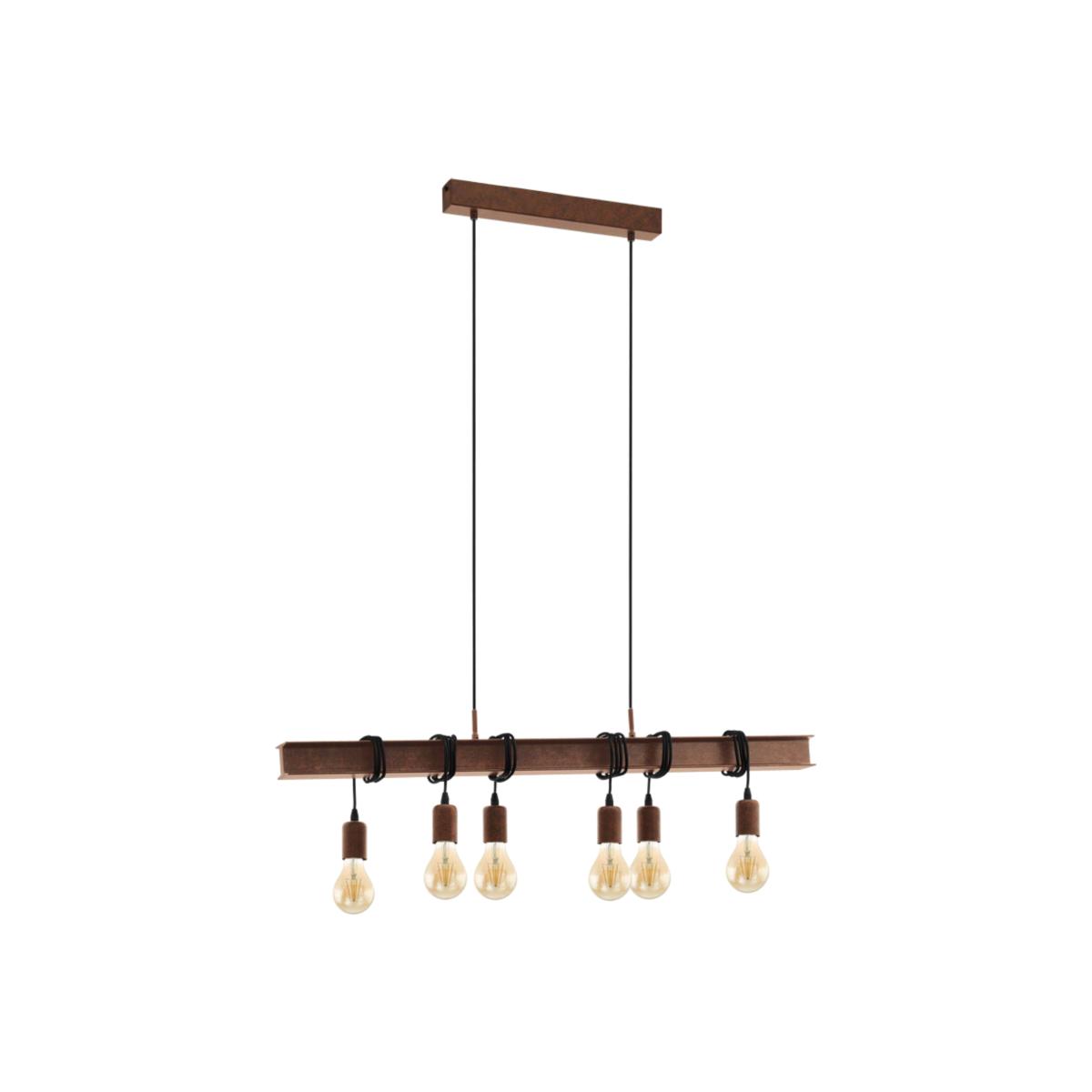 Rustic 6 light ceiling light bar boasting a steel frame suspending antique metal pendants. The Townshend 6 light steel ceiling light is a beautifully unique piece from Eglo Lighting. A rustic steel metal bar frame suspends 6 matching antique metal lamp holders which will look complete with vintage filament light bulbs. These lights can be individually adjusted by wrapping the flex around the steel bar giving a rustic and unique style. Pair this light with our 4w LED Vintage bulbs for a rustic and industrial glow to complement the exposed bulb styling.