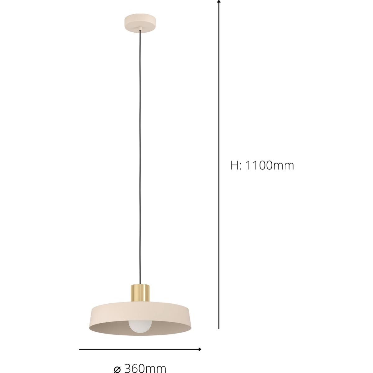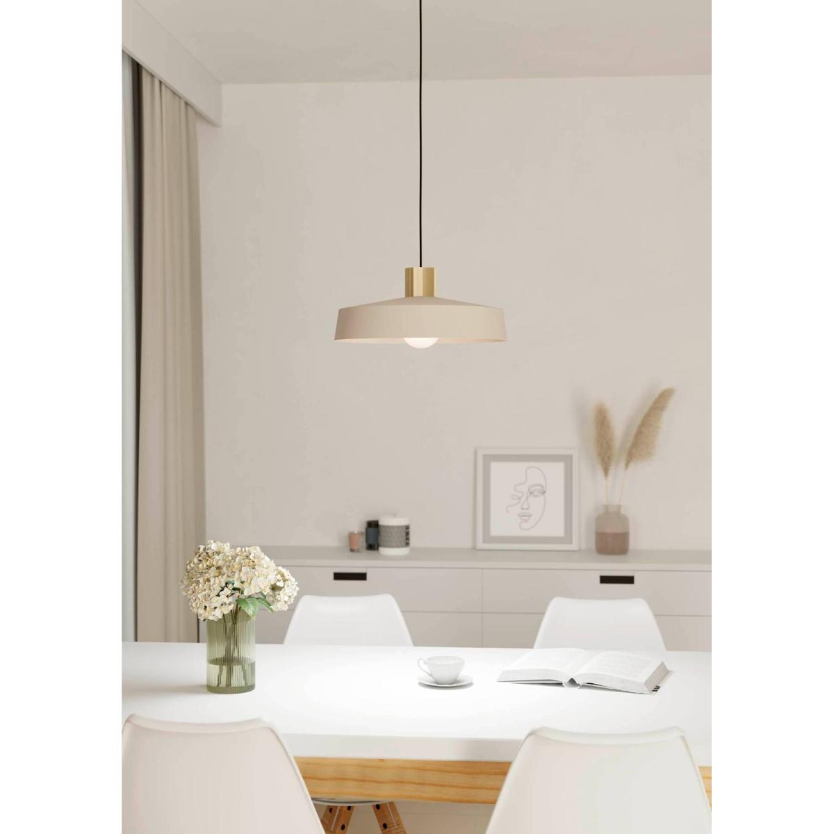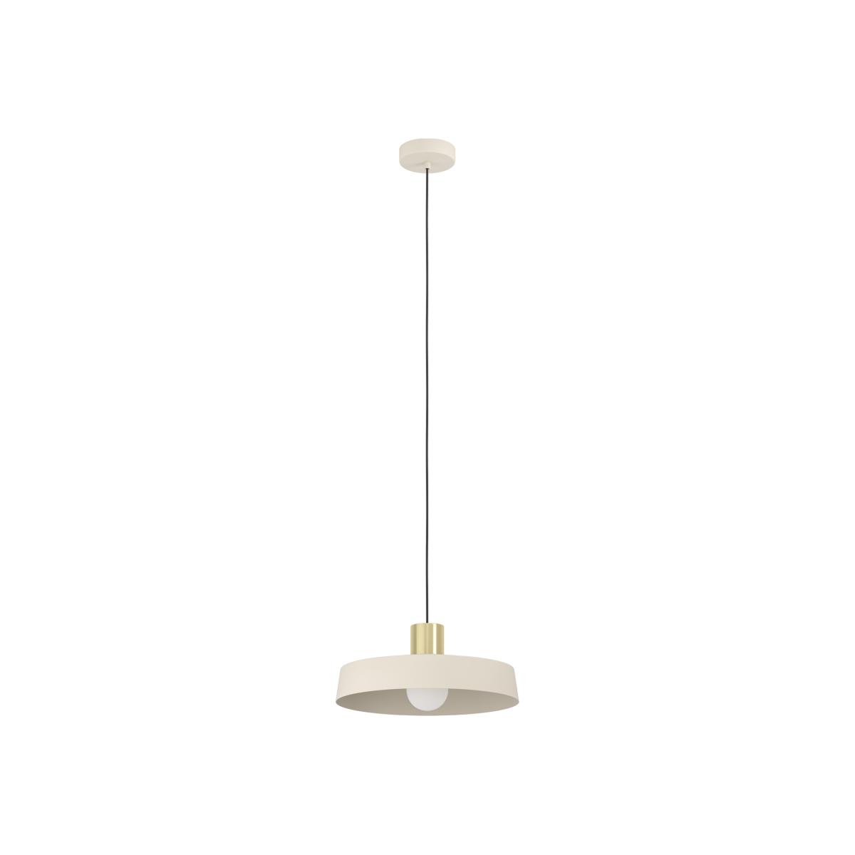 The product is a single pendant light with an angular lampshade in sandy-coloured steel and brushed brass accents. The contrast of a neutral palette with metallic accents gives the pendant a sophisticated look. Enhance the semi-visible lightbulb design with a retro lightbulb for added drama. The stylish pendant complements a range of interiors and adds an elegant touch to any space.