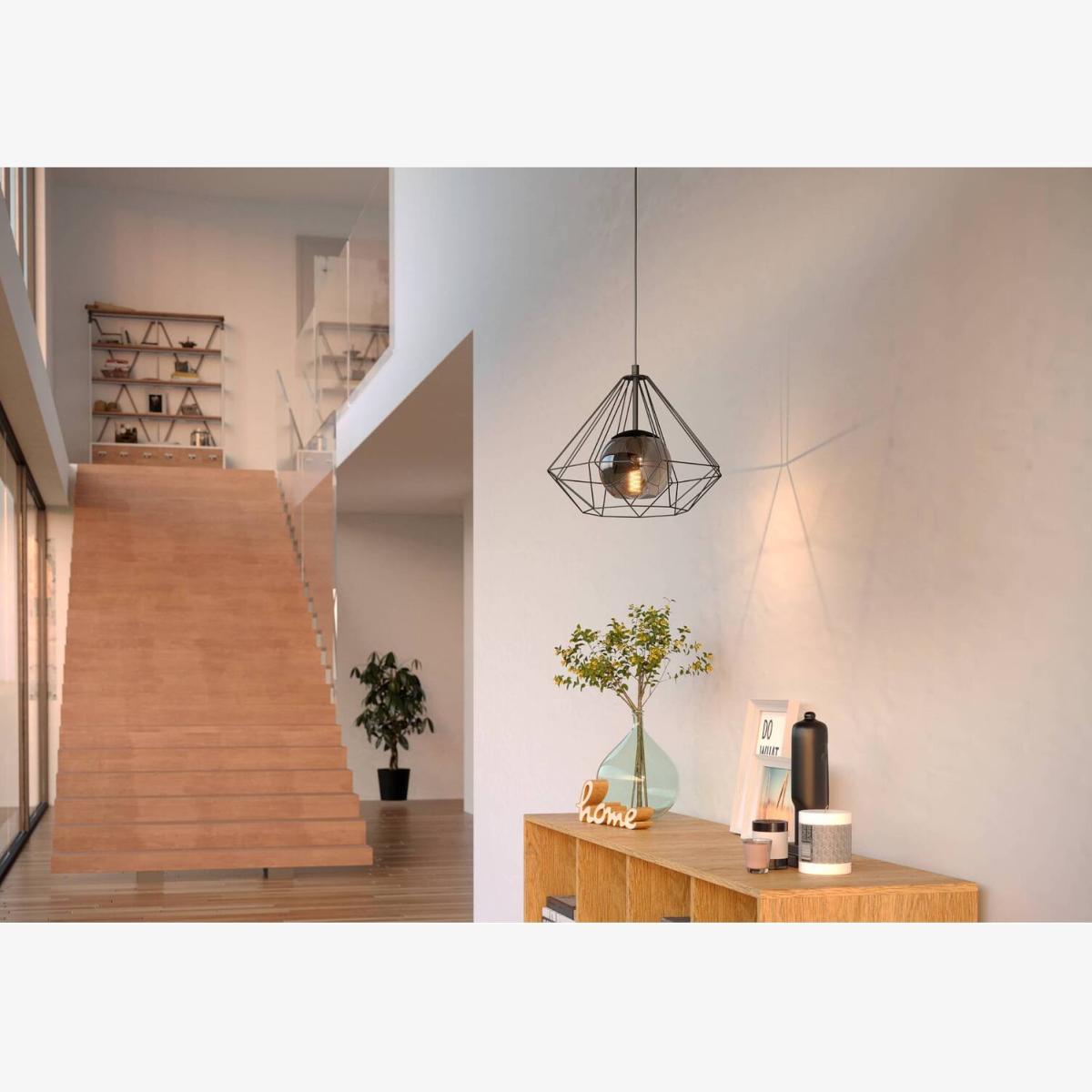 Introducing the Vernham Pendant Light - Elevate your space with this exquisite pendant light. Its black diamond-shaped wire lampshade encases an inner smoked black glass sphere, casting a captivating interplay of light and shadow when illuminated. Designed to seamlessly complement modern interior styles, the Vernham pendant light is equally at home in your living roomor suspended above your dining table. Please note that the lightbulb is not included. With a convenient E27 lamp holder, it awaits your choice of E27 lightbulb to create the perfect ambiance. Illuminate your space with sophistication!