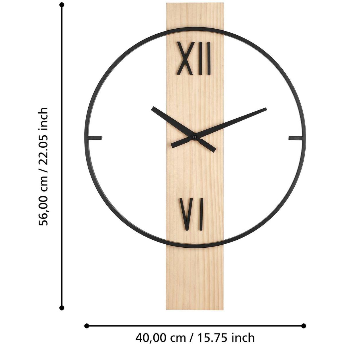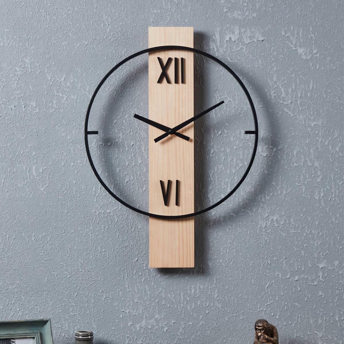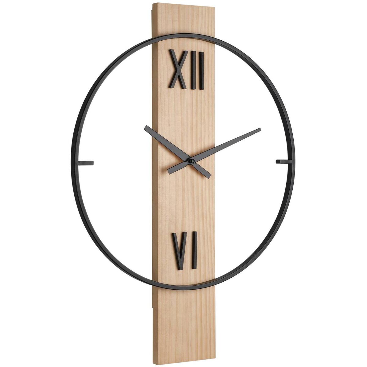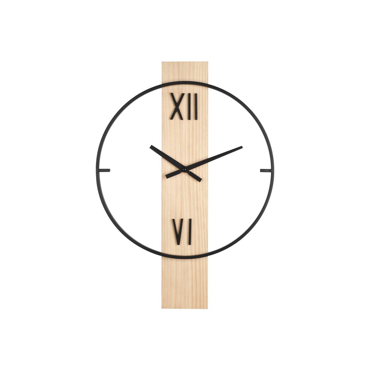 The YAMATSURI skeleton wall clock showcases contrasting shapes and textures, combining a round steel frame and linear wooden panel. The numberless clock face, adorned only with Roman numerals at 12 and 6, adds to the clock's allure, embracing a minimalist design that makes it a true statement piece in any room. Measuring 56 cm x 40 cm, the product makes a bold statement for classic and contemporary interiors, to be displayed proudly in the living room, kitchen or even hallway.